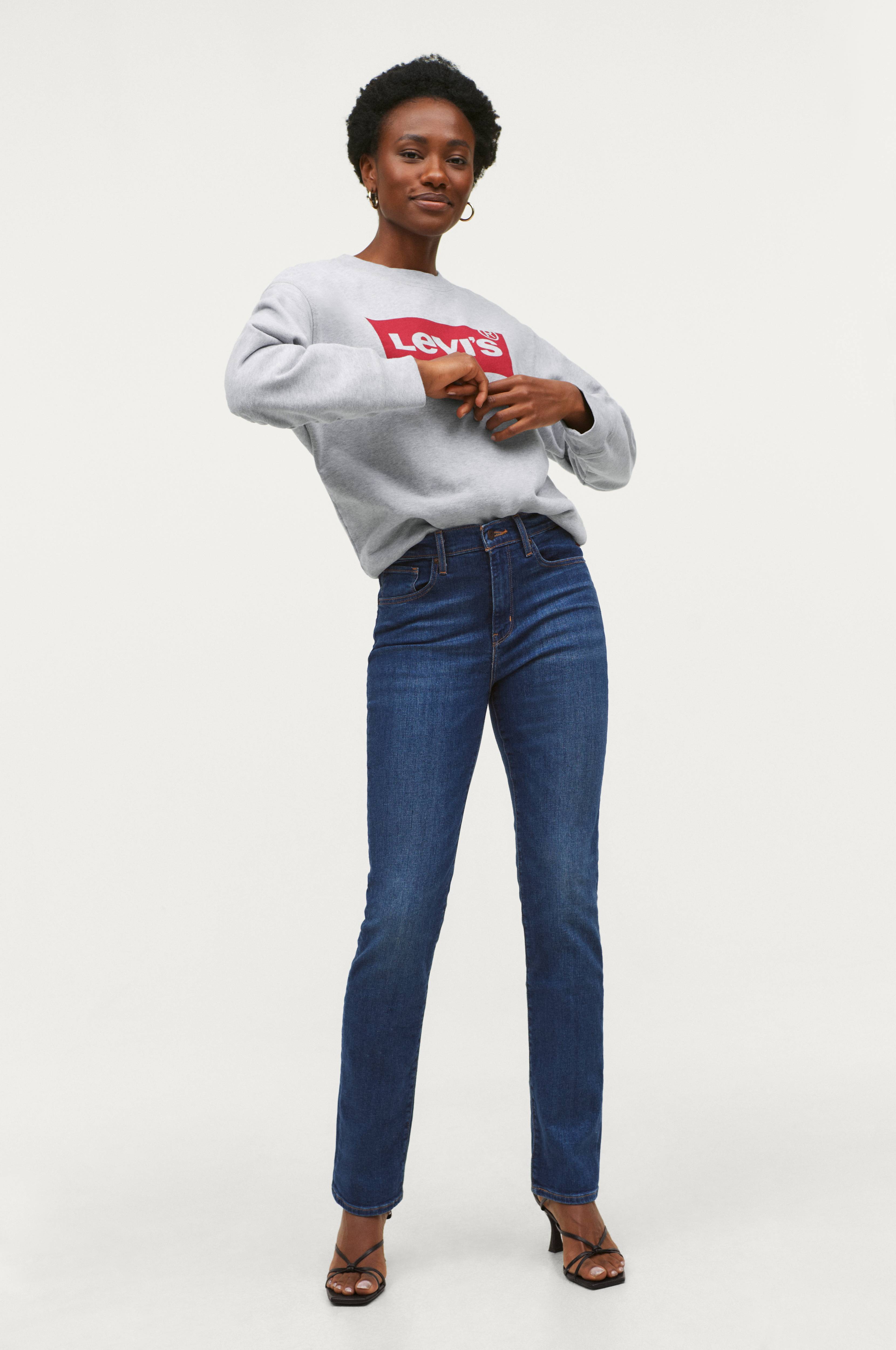 Jeans 724 High Rise Straight fra Levi's. Flot, smal model med høj talje og smalle men lige ben. Linning med stropper og lynlås i gylpen samt tre lommer foran og to lommer bagpå.