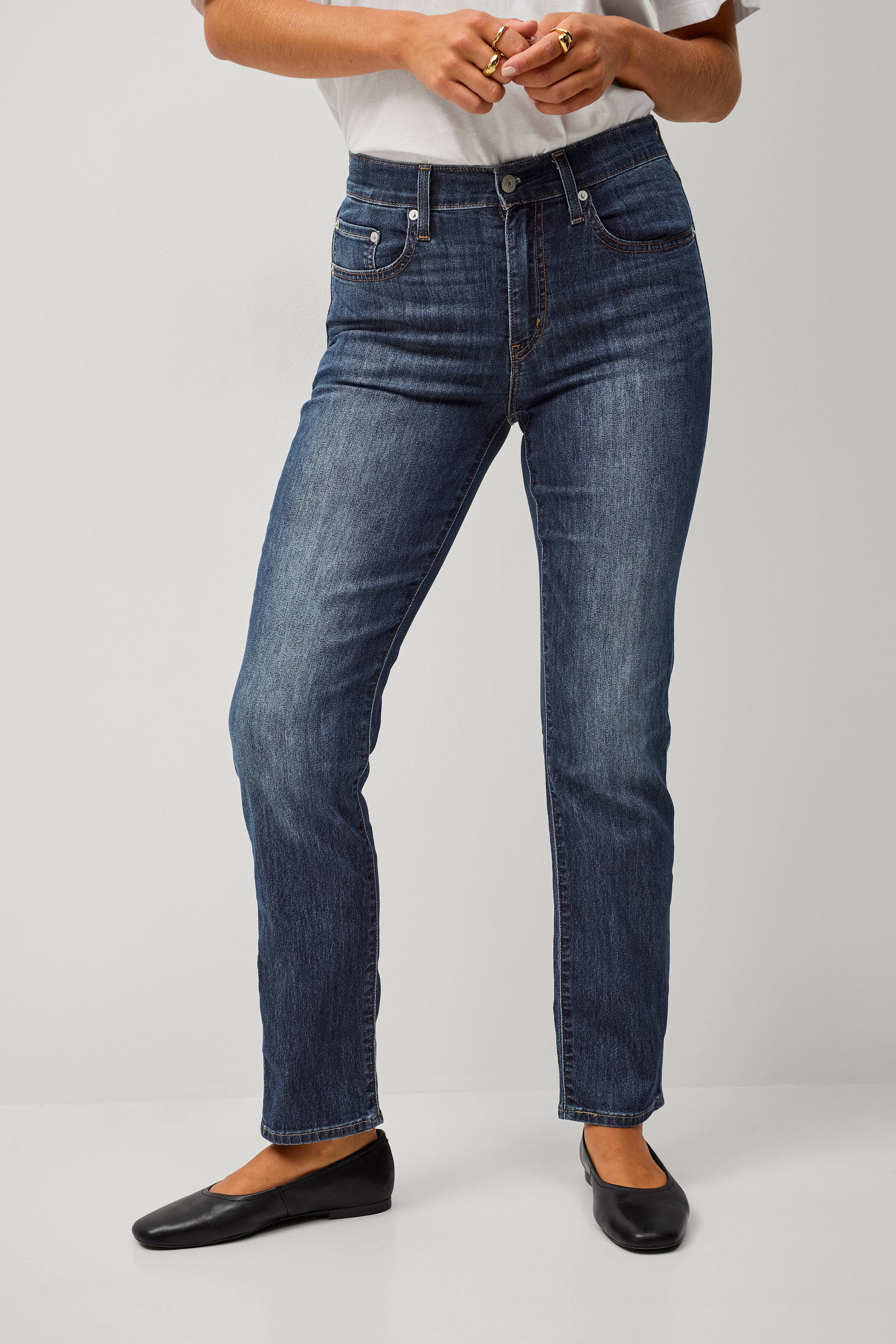 Jeans 724 High Rise Straight fra Levi's. Flot, smal model med høj talje og smalle men lige ben. Linning med stropper og lynlås i gylpen samt tre lommer foran og to lommer bagpå.