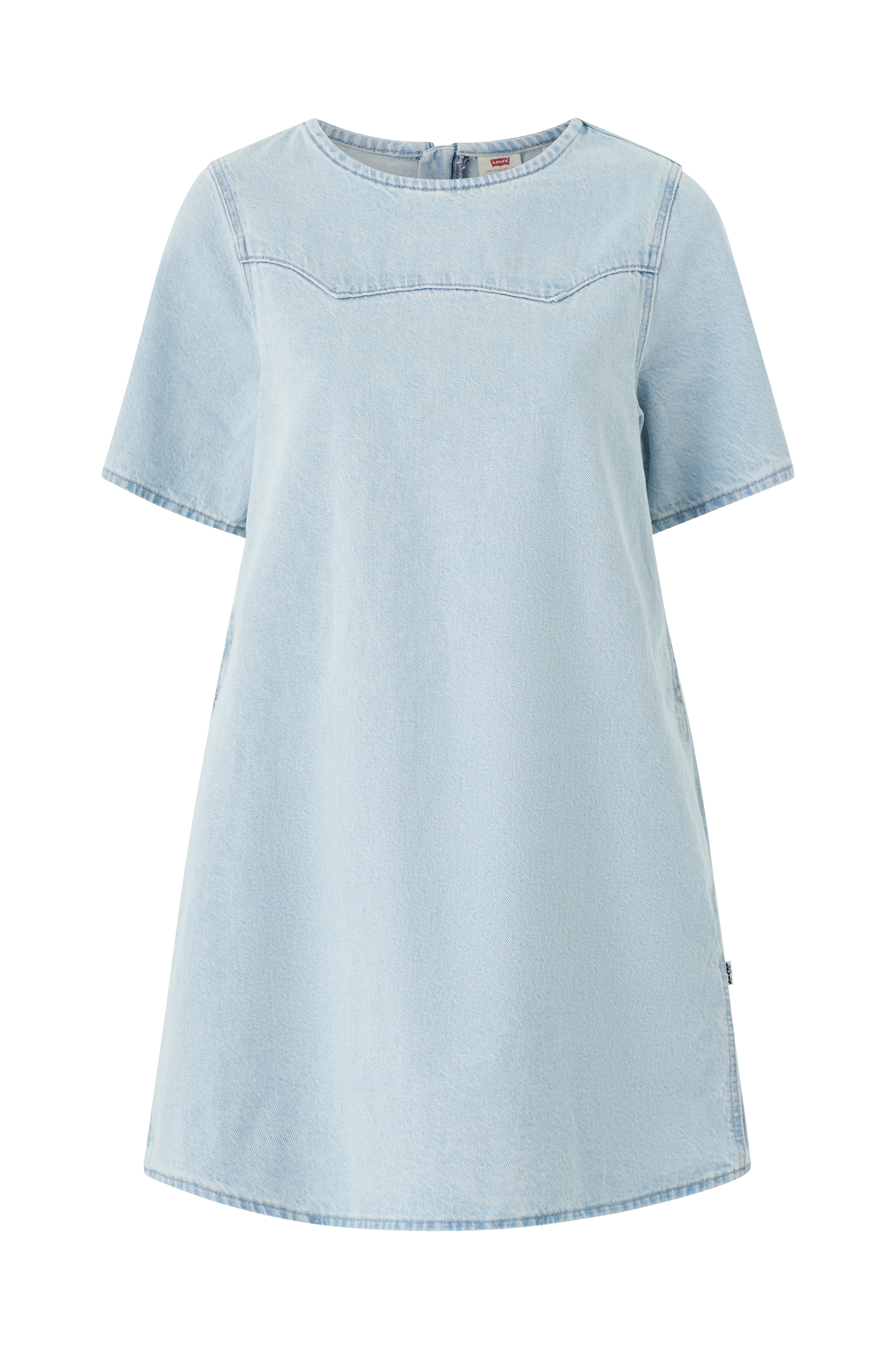 • Model med svaj i Tung denim• Rund hals med lynlås i nakken• Dekorativt strikket linning foran• Bokslæg i ryggen• Kort ærme• Sidelommer• Længde: 86 cm i størrelse S