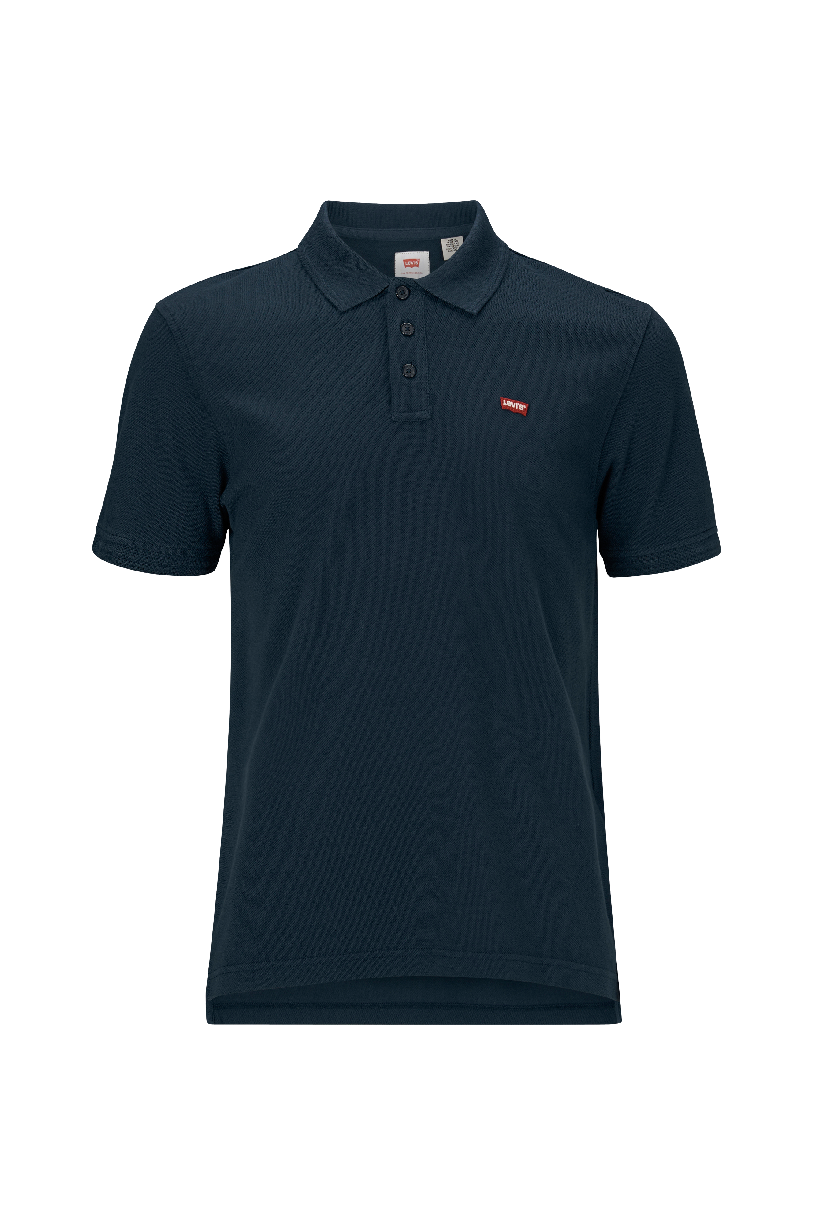 Poloshirt Housemark Polo fra Levi's i klassisk model med krave i rib og stolpelukning med tre knapper. Ribbede kanter i ærmerne, slids i siderne og noget længere bagstykke. Længde bagpå ca. 75 cm i str. M.