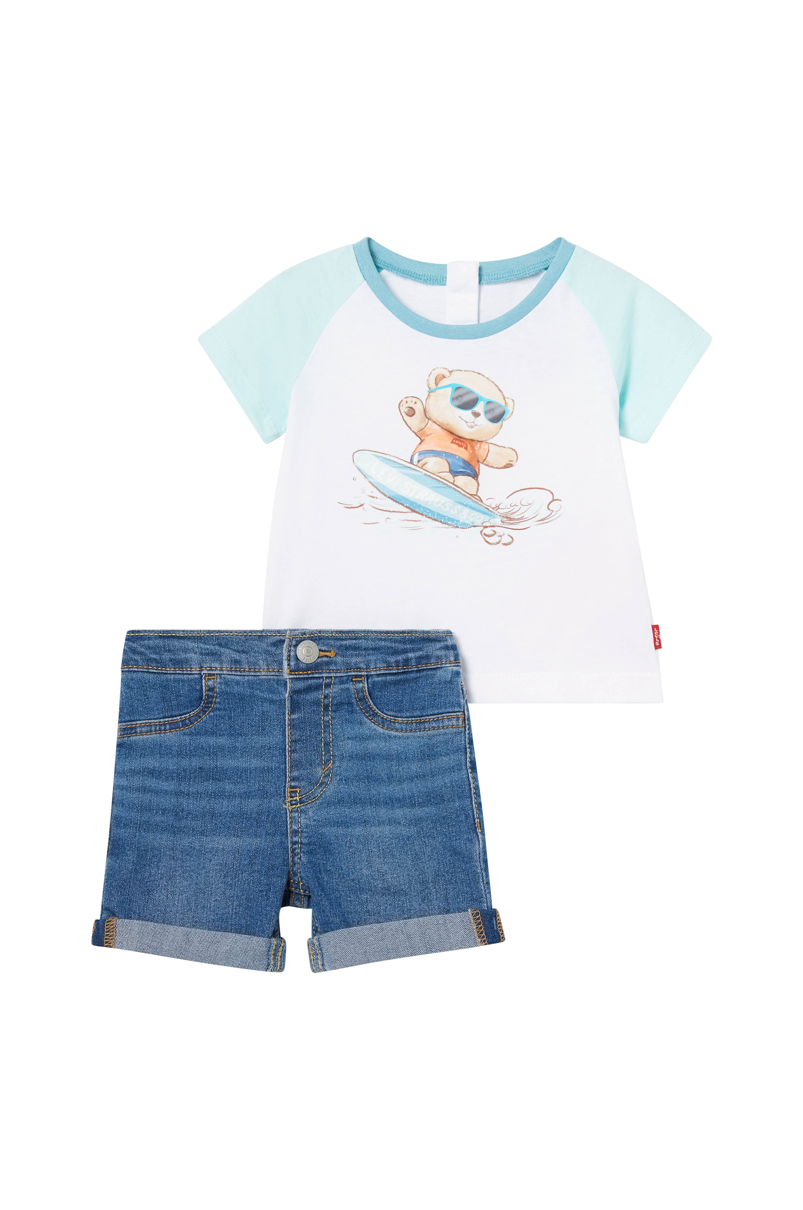 • 2-delt sæt• T-shirt med kort ærme• Rund halsudskæring• Tryk foran• Denimshorts i strækdenim• Hægtelukning• Syede benafslutninger