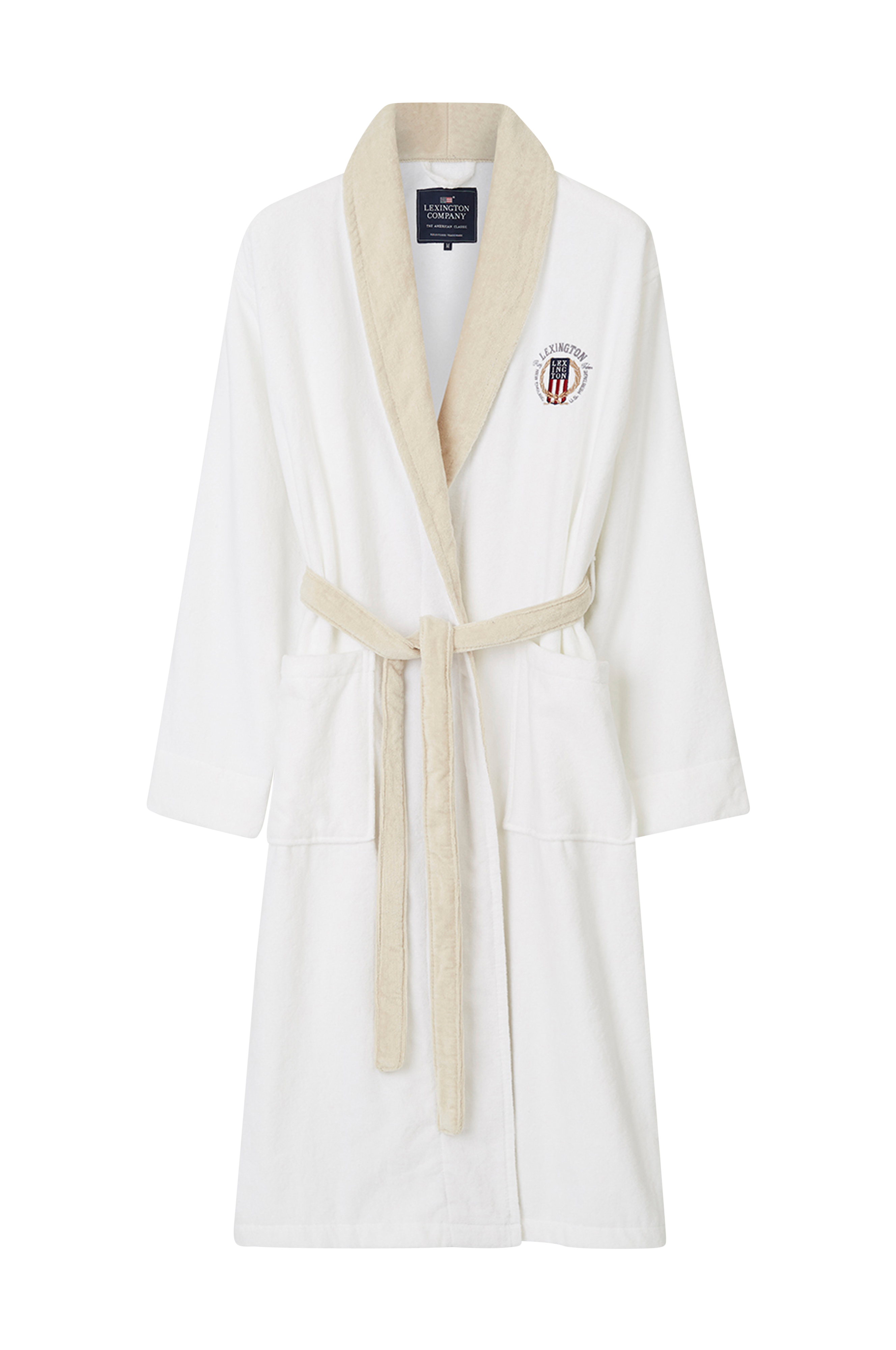 Blød badekåbe i skøn bomuldsvelour med matchende bælte i taljen og broderet Lexington-logo. Denne badekåbe er i unisex-model og har kontrastfarvet krave og lommer foran.