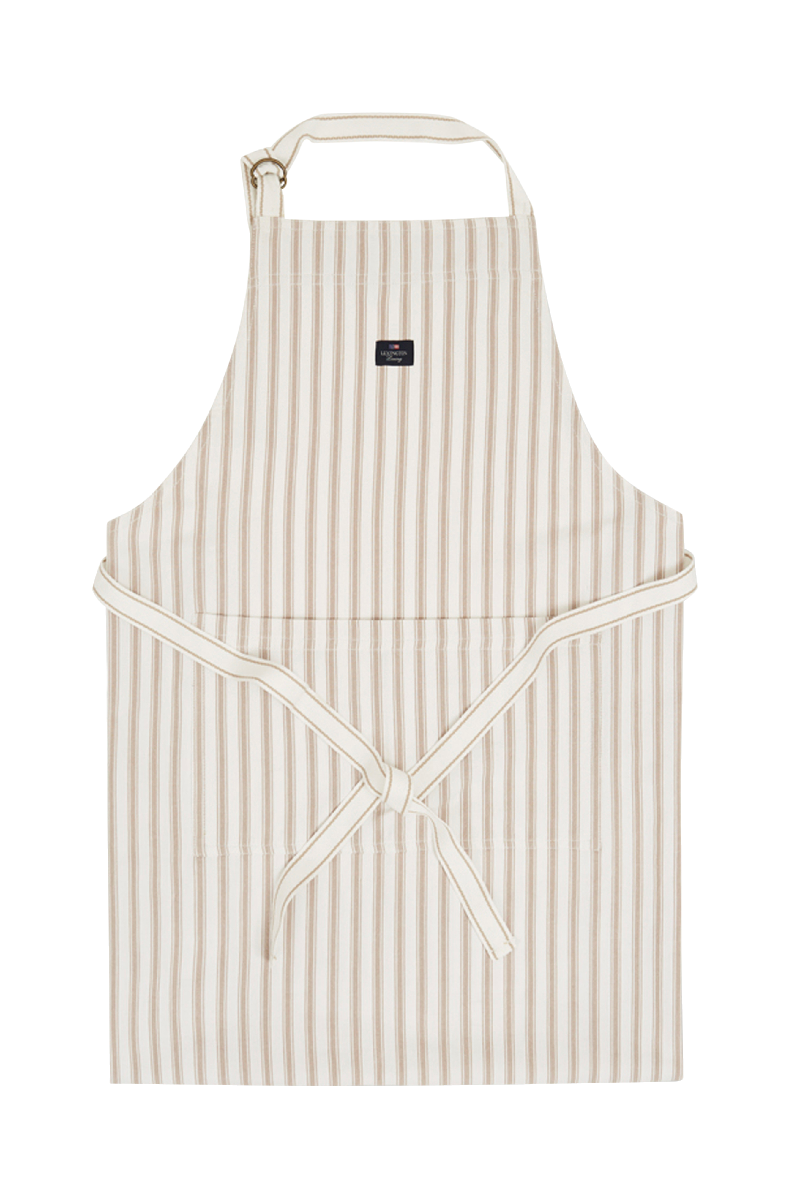Forklæde med uimodståelige striber fremstillet i sildebensvævet bomuld. Forklædet har kantbånd i samme stof samt mærke.