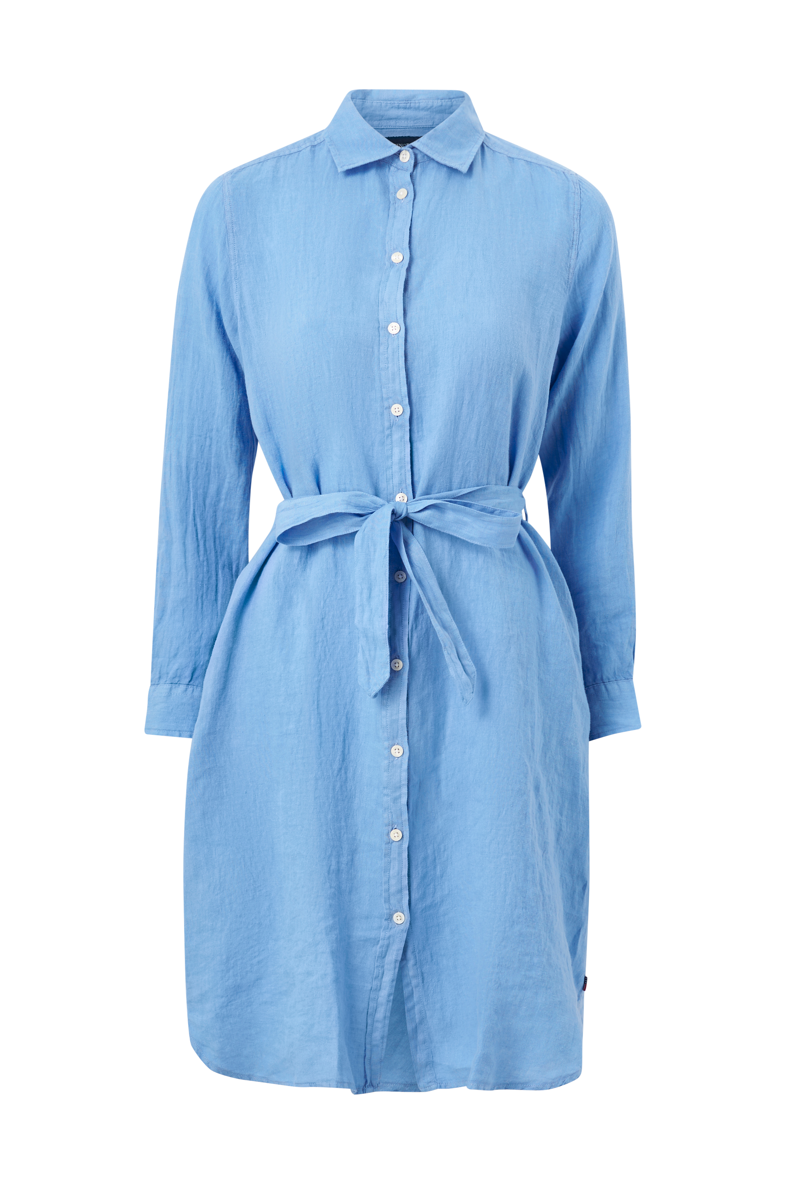 Stilren skjortekjole af hør. Knapper foran, lange ærmer og lommer i siderne. Aftageligt bindebælte i taljen. Længde ca. 105 cm i str. S.