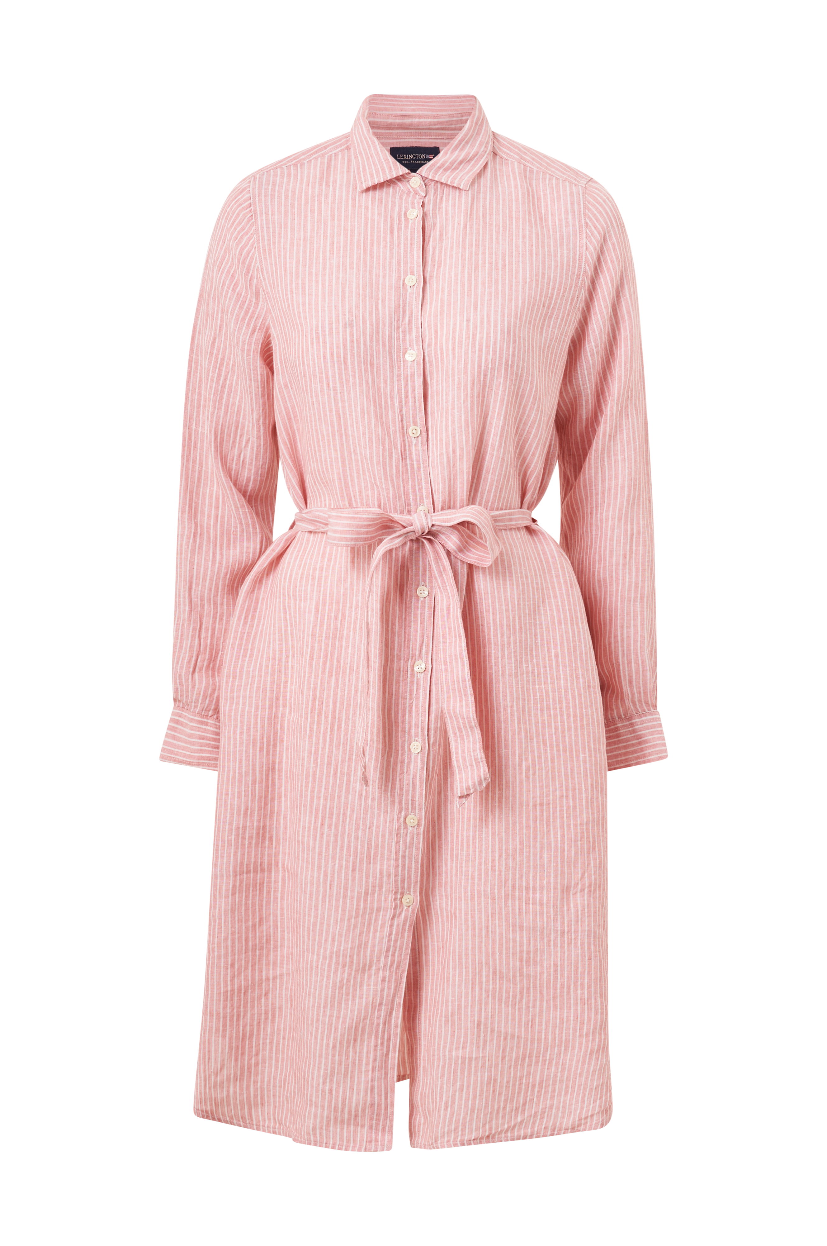 Stilren skjortekjole af hør. Knapper foran, lange ærmer og lommer i siderne. Aftageligt bindebælte i taljen. Længde ca. 105 cm i str. S.