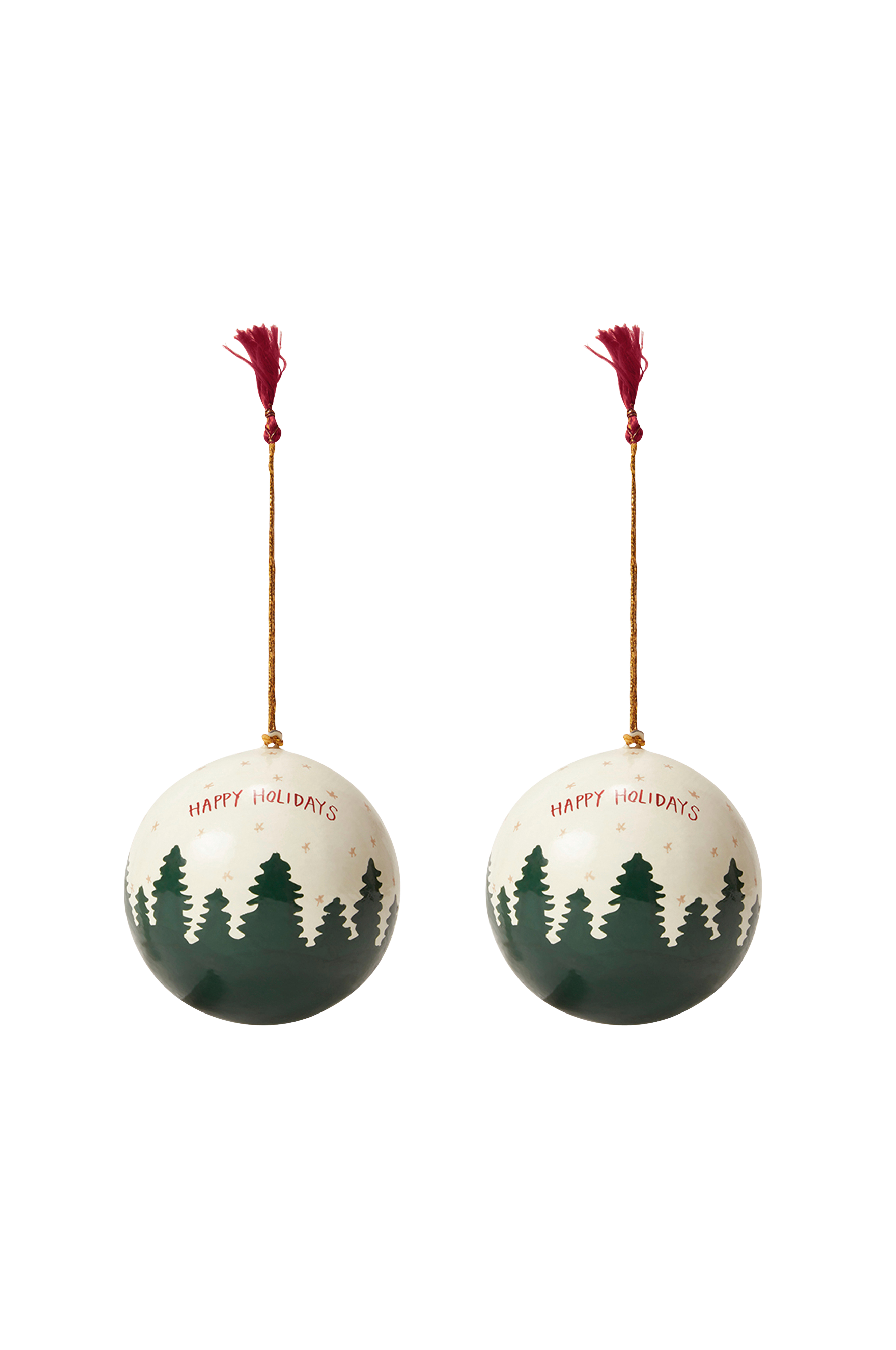 Vores sæt med to julepærer i papmaché har en snedækket baggrund med majestætiske fyrretræer, som på kunstnerisk vis bringer lidt af naturen ind. Perfekt til at pynte på juletræet eller kaminhylden ... eller til at sætte på en gave i stedet for en sløjfe. Hvert stykke er håndlavet af 100 % papmaché af lokale håndværkere og er sit eget unikke kunstværk med små variationer, der giver karakter. 100 % papir
