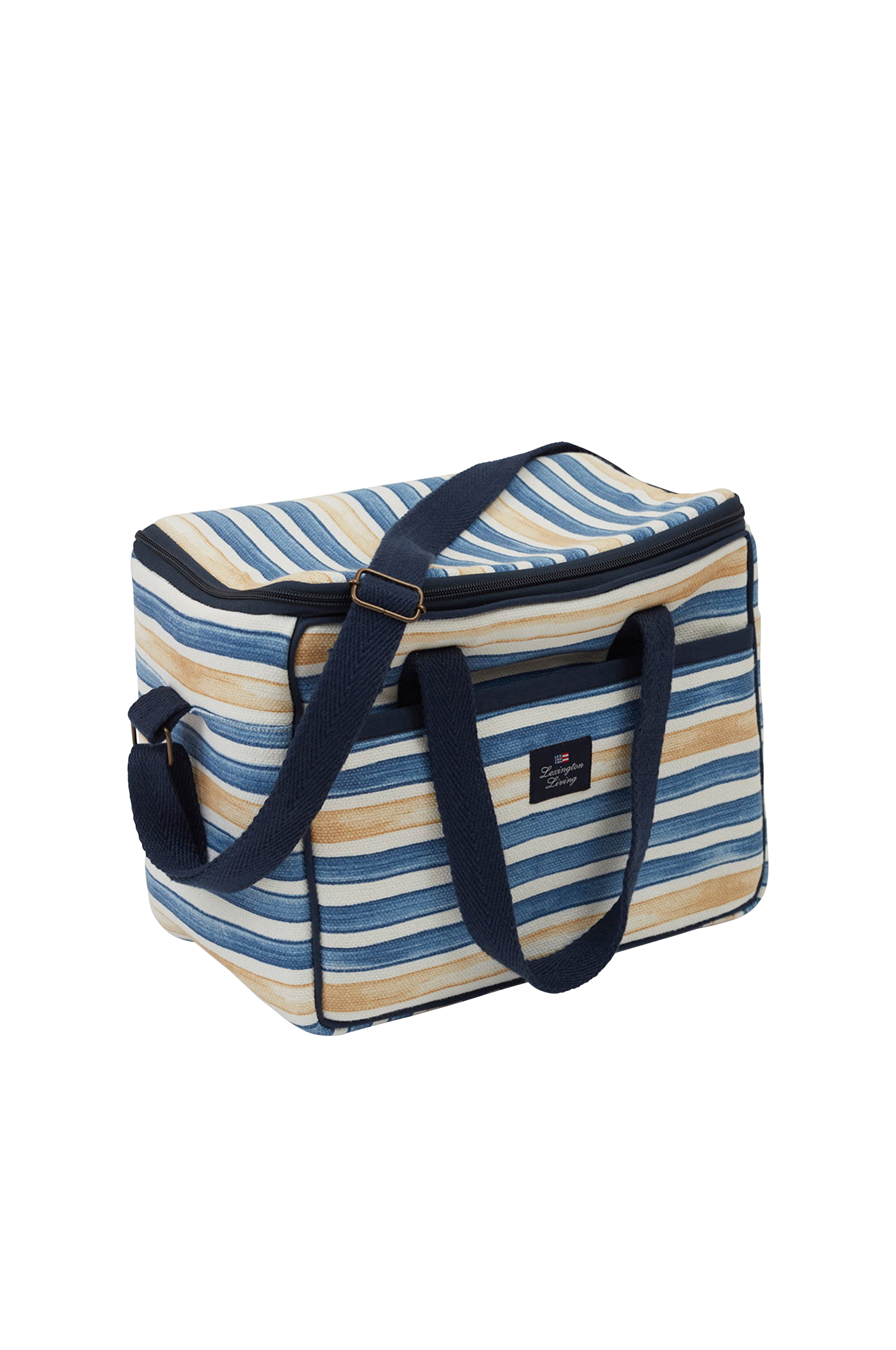 Hold dine drikkevarer kølige med stil med denne køletaske af genindvundet bomuld og isolering med genindvundet polyester og aluminium. Denne køletaske har et sommerinspireret, stribet design som er behandlet med en vandafvisende UV-belægning. En sildebensvævet strop til ophængning og skulderrem samt yderlommer på for- og bagsiden giver sidste touch til den praktiske taske.