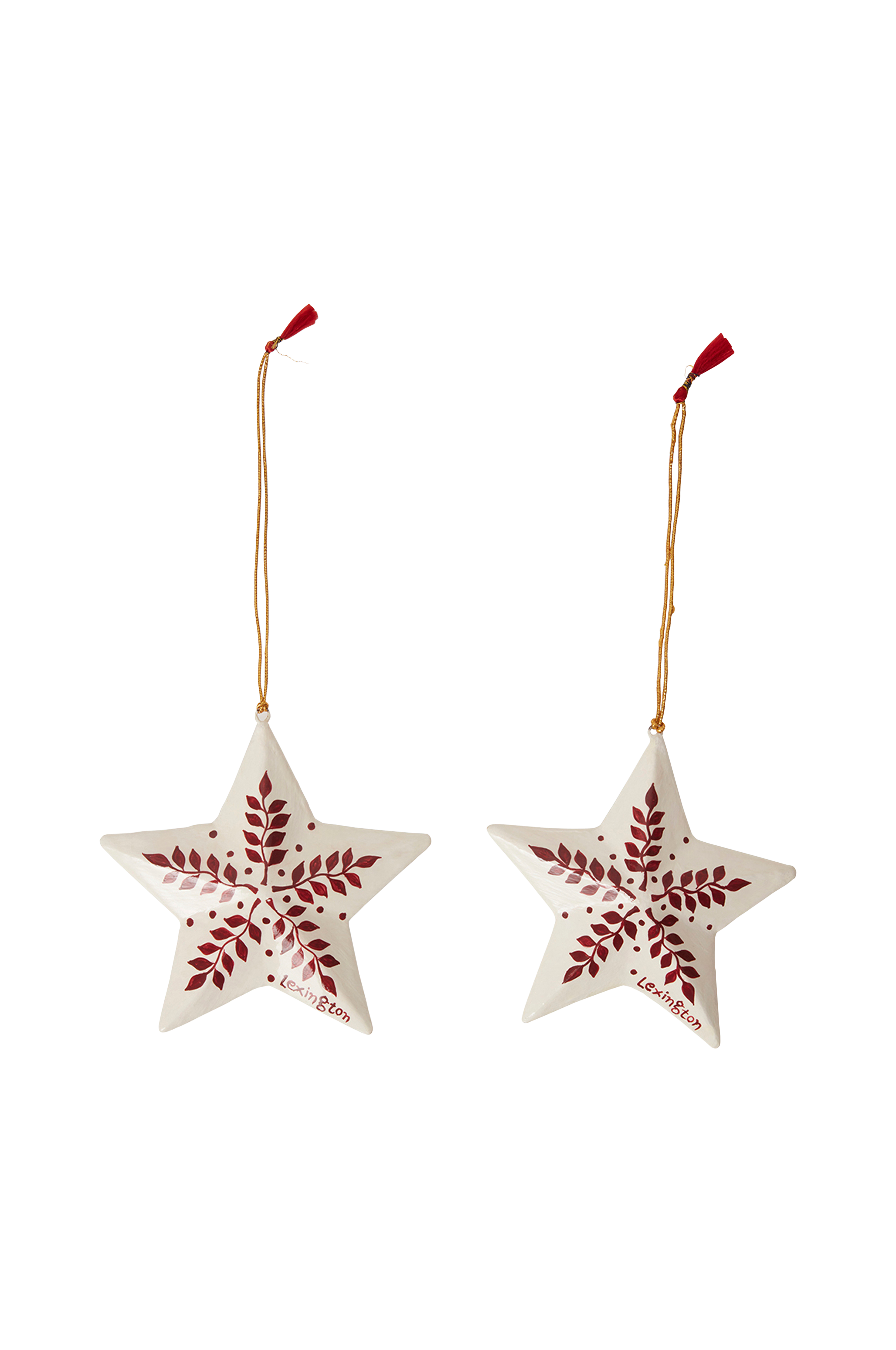 Vores sæt med to juleornamenter i papmaché har et elegant bladdesign på en festlig hvid stjerne. Perfekt til at pynte på juletræet eller kaminhylden ... eller til at sætte på en gave i stedet for en sløjfe. Hvert stykke er håndlavet af 100 % papmaché og er sit eget unikke kunstværk med små variationer, der giver det karakter. 18x8x8 cm. 100 % papir