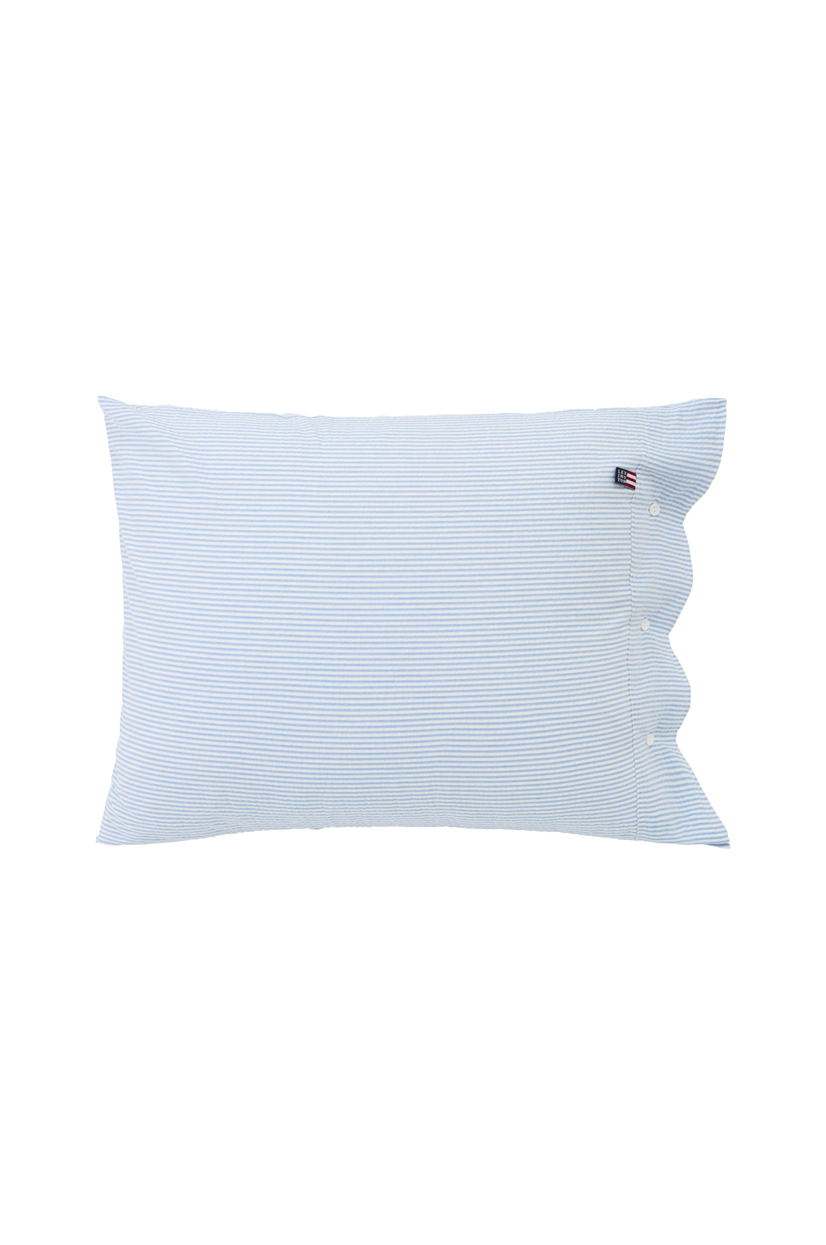 Dette pudebetræk med et mønster med tynde striber er fremstillet i bæk-og-bølgestof af bomuld og har en krøllet struktur som giver et luftigt og let udtryk. Dette bomuldspudebetræk i bæk-og-bølgestof er afsluttet med dobbelte sømme og en lukning med logoprægede gummiknapper.