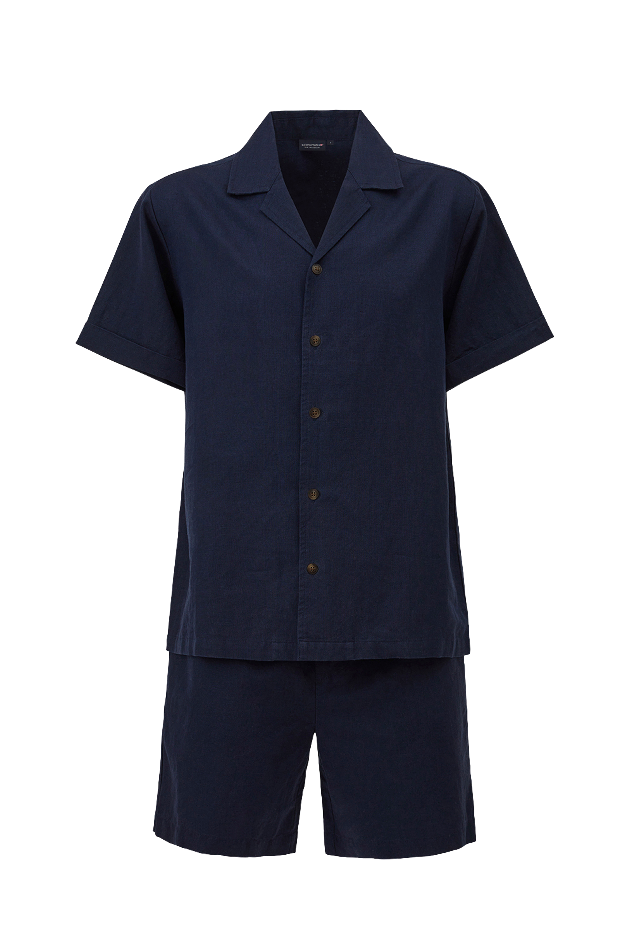 Denne herrepyjamas er fremstillet i en blød blanding af bomuld og hør og har knaplukning foran. Overdelen til denne herrepyjamas har korte ærmer og en forlomme med Lexington-flag, mens bukserne har en elastisk talje med løbegang i samme stof, sidelommer og baglomme.