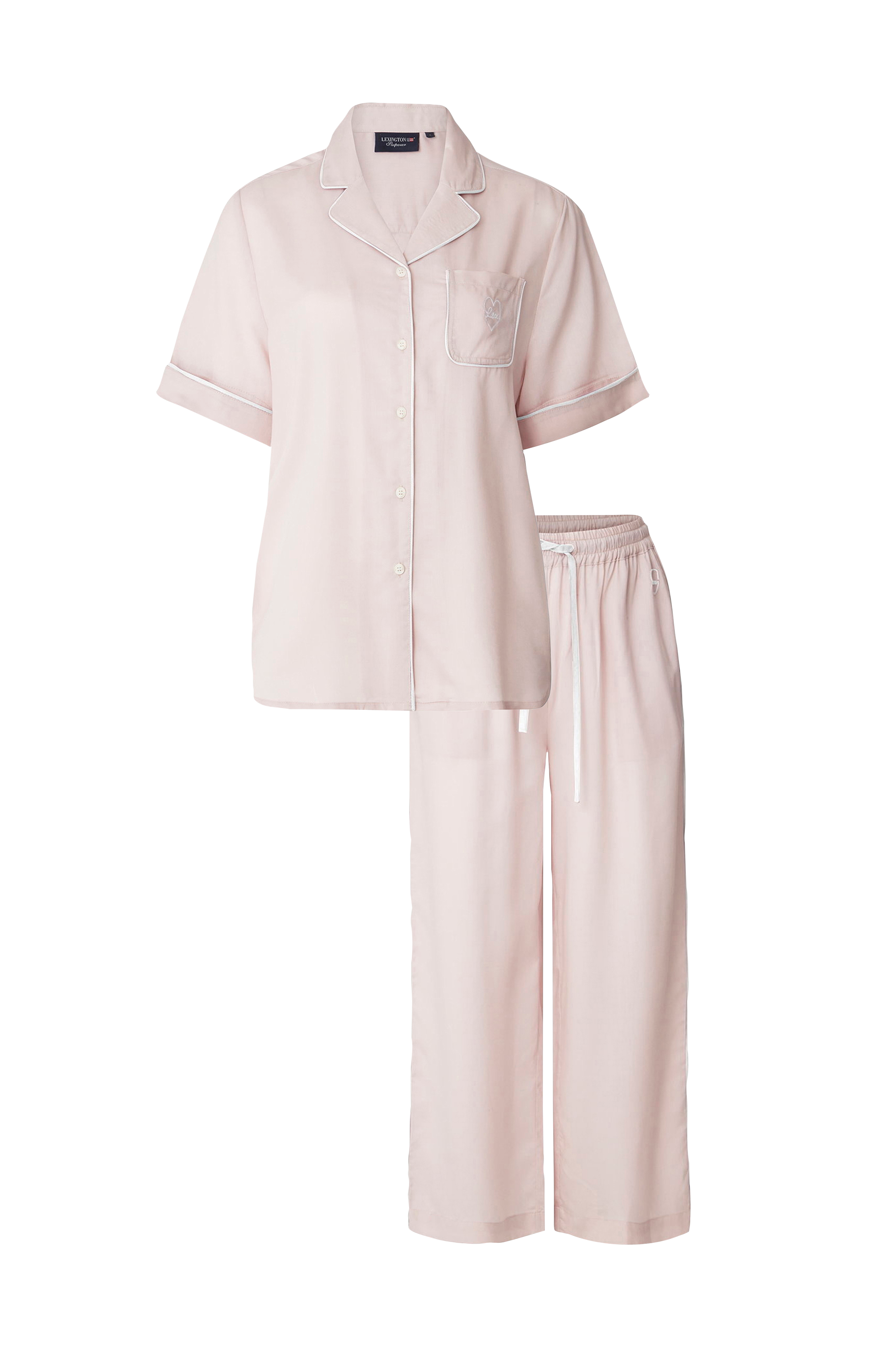 Lexingtons bløde Lyocell-pyjamas Lauren er klassiske og utrolig behagelig. Toppen har traditionelle detaljer som knaplukning foran, korte ærmer, enkelt brystlomme og Lexingtons hjertebroderi forneden. Bukserne med middelhøj talje har en behagelig elastik med snøre, sidelommer og et sødt broderet hjerte. Lyocell er ikke kun superblødt og luksuriøst, men også biologisk nedbrydelig. Drøm sødt!