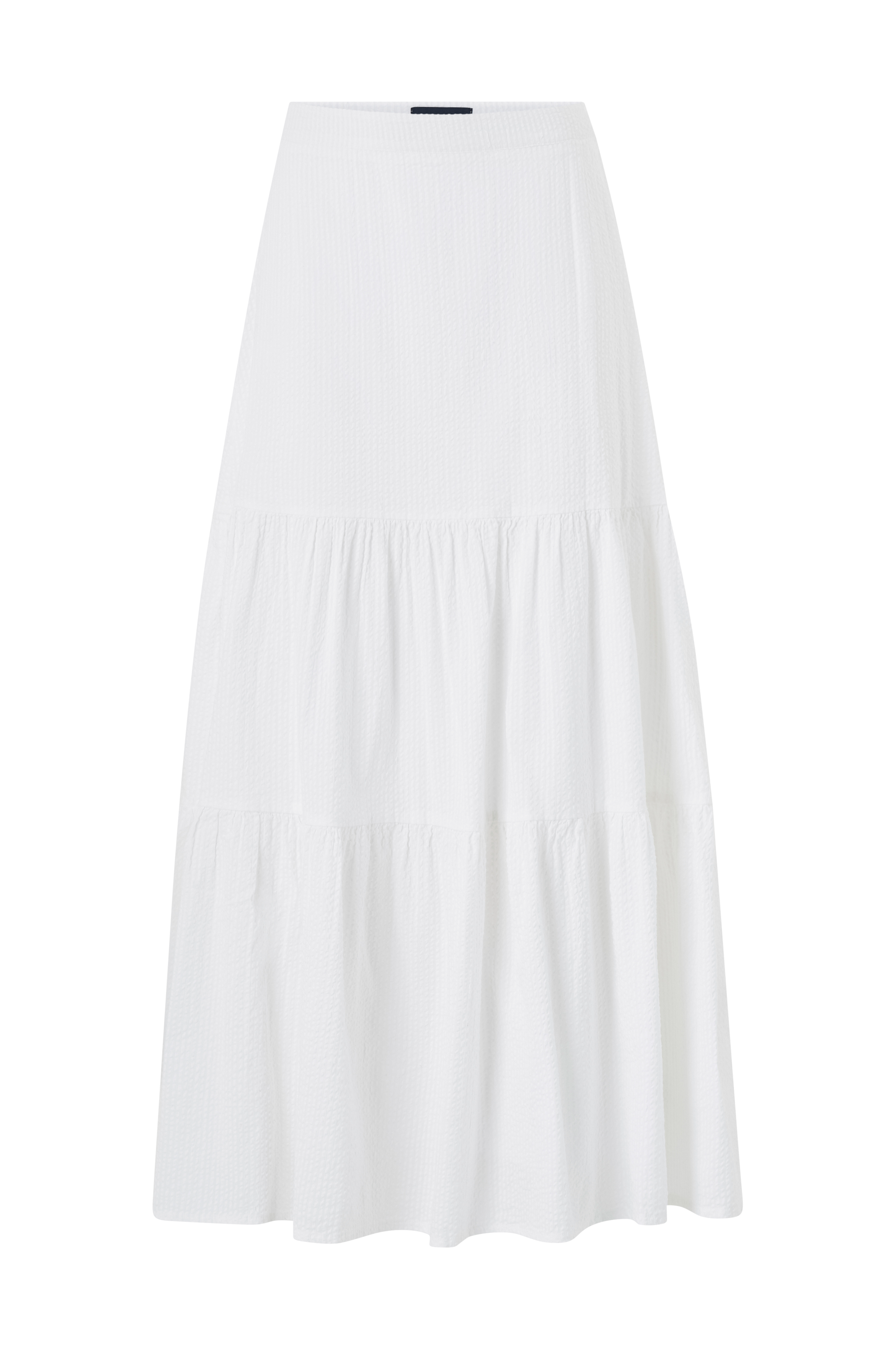 Denne seersucker maxi-nederdel fra Lexington i hvid udstråler tidløs elegance. Den har et hellangt design med en udflydende form, der giver en yndefuld, flydende silhuet. Nederdelen er foret for ekstra komfort og en raffineret finish, mens seersuckerstoffet giver en struktureret, luftig fornemmelse. En usynlig lynlås i sidesømmen sikrer et sømløst look. Denne nederdel er perfekt til enhver lejlighed og kombinerer klassisk stil med moderne raffinement.