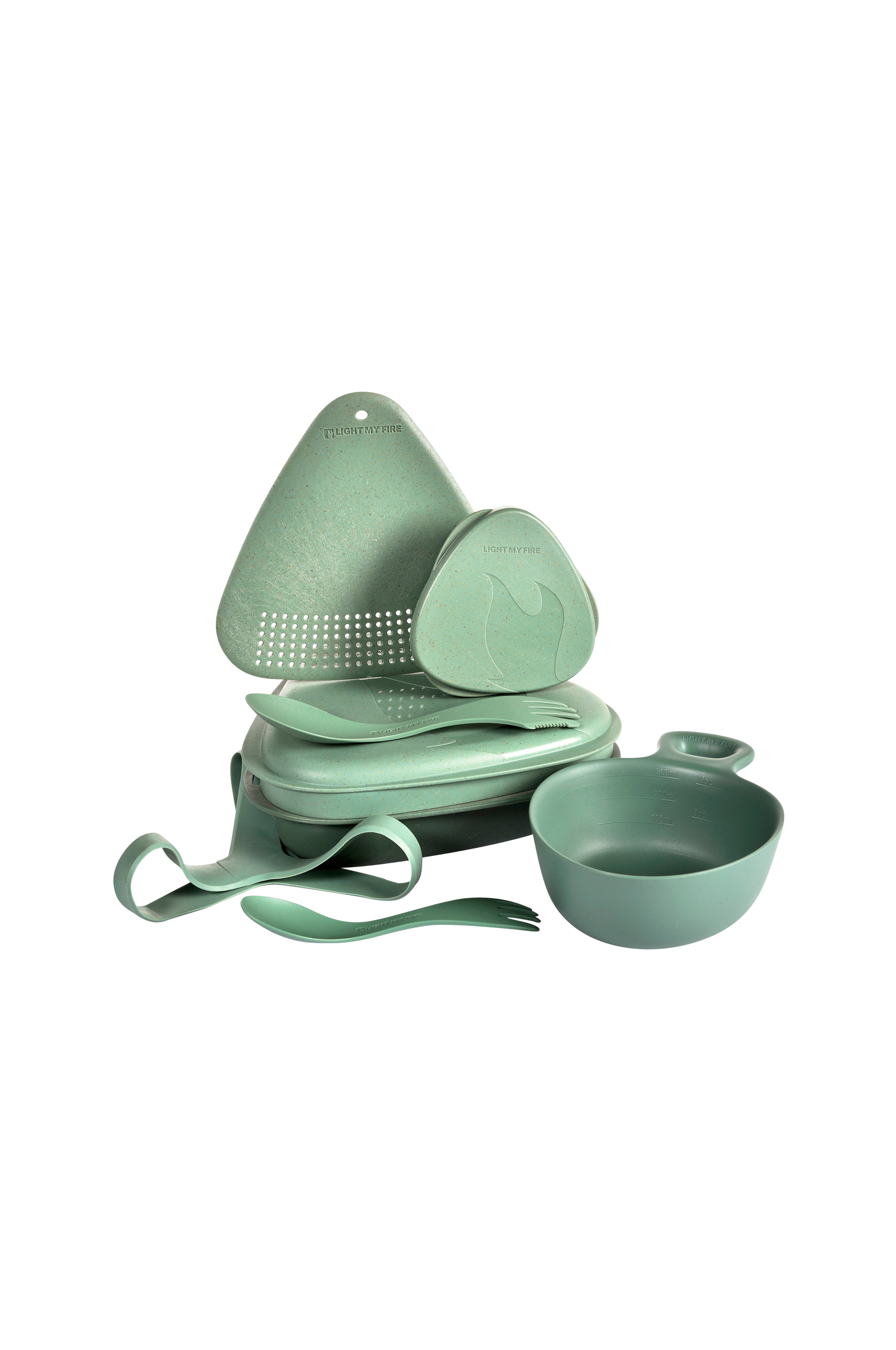 Kombineret skærebræt/si, tallerken og skål til at spise af og legendariske Spork i to størrelser - ske, gaffel og kniv i én.