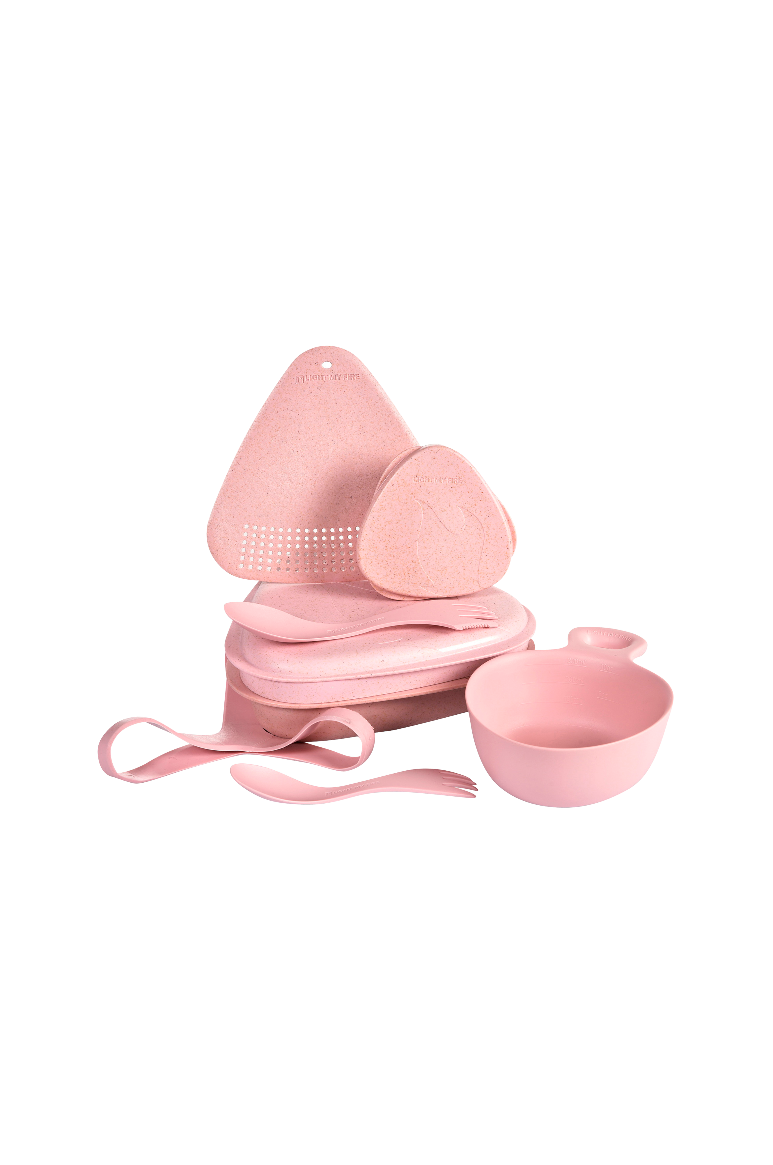 Kombineret skærebræt/si, tallerken og skål til at spise af og legendariske Spork i to størrelser - ske, gaffel og kniv i én.
