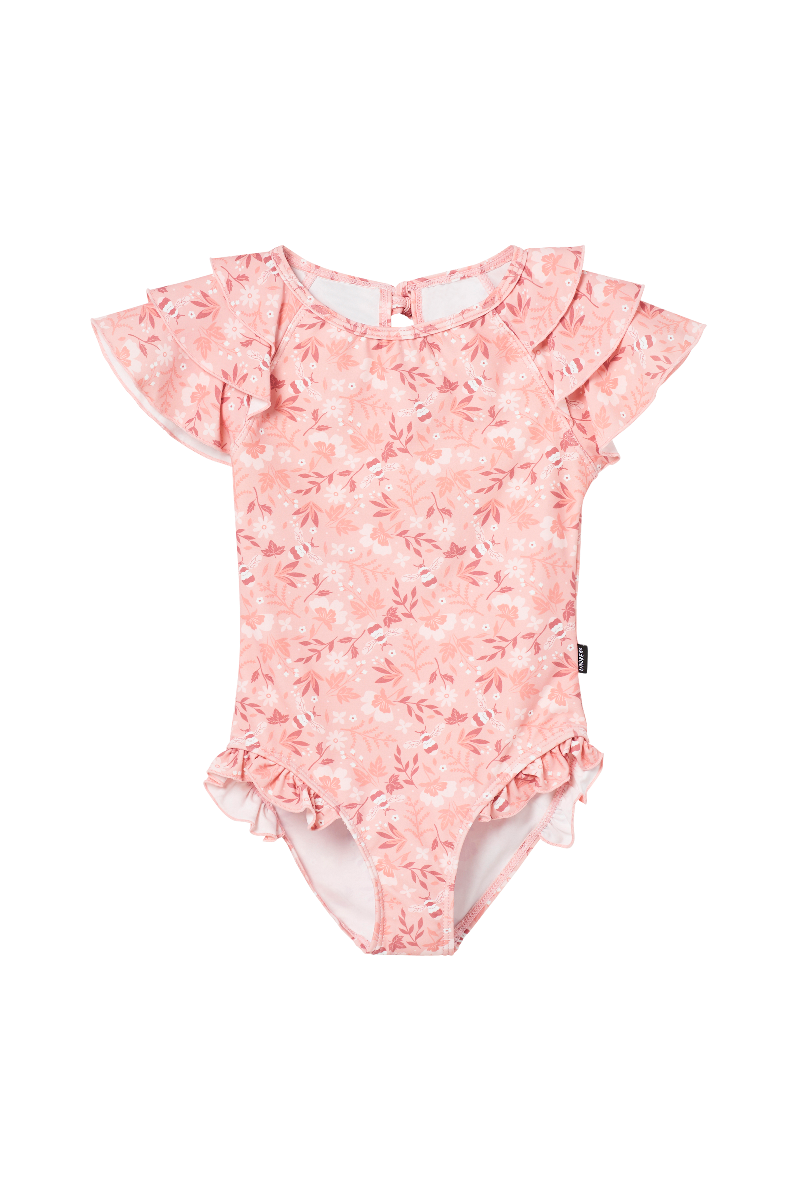 • Badedragt med ekstra stof over skuldrene• Rund halsudskæring• Ventilation med bindebånd i nakken• Flæsekanter på benåbningerne• Helt foret• Uv-beskyttelse: UPF 50+