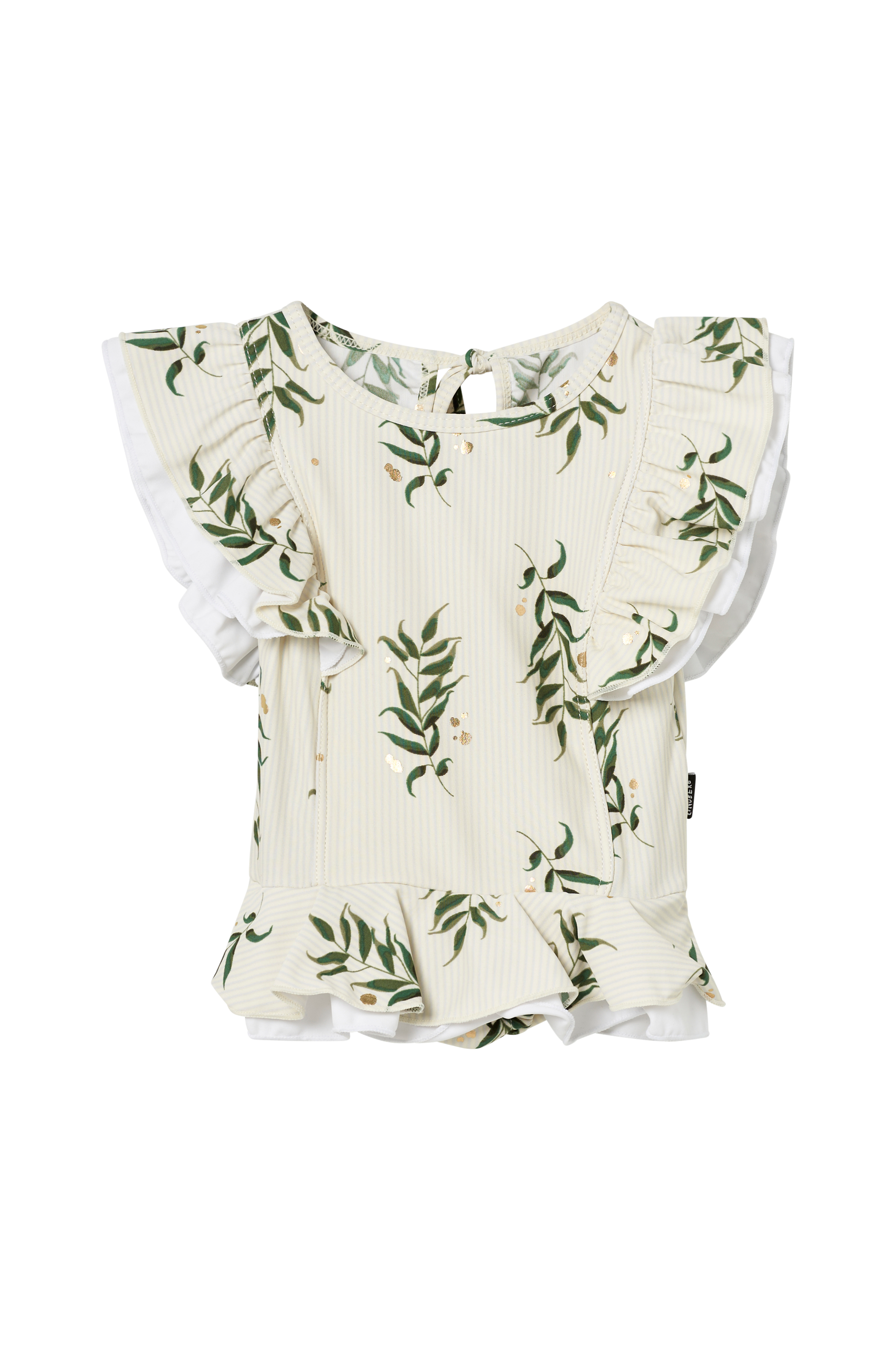 En tæt og god blebadedragt til de mindste med "blefunktion" for at undgå lækage. Kan bruges både ude og inde. Materialet har en solbeskyttelsefaktor på 50+. Elastisk benåbning. Bindes i nakken.