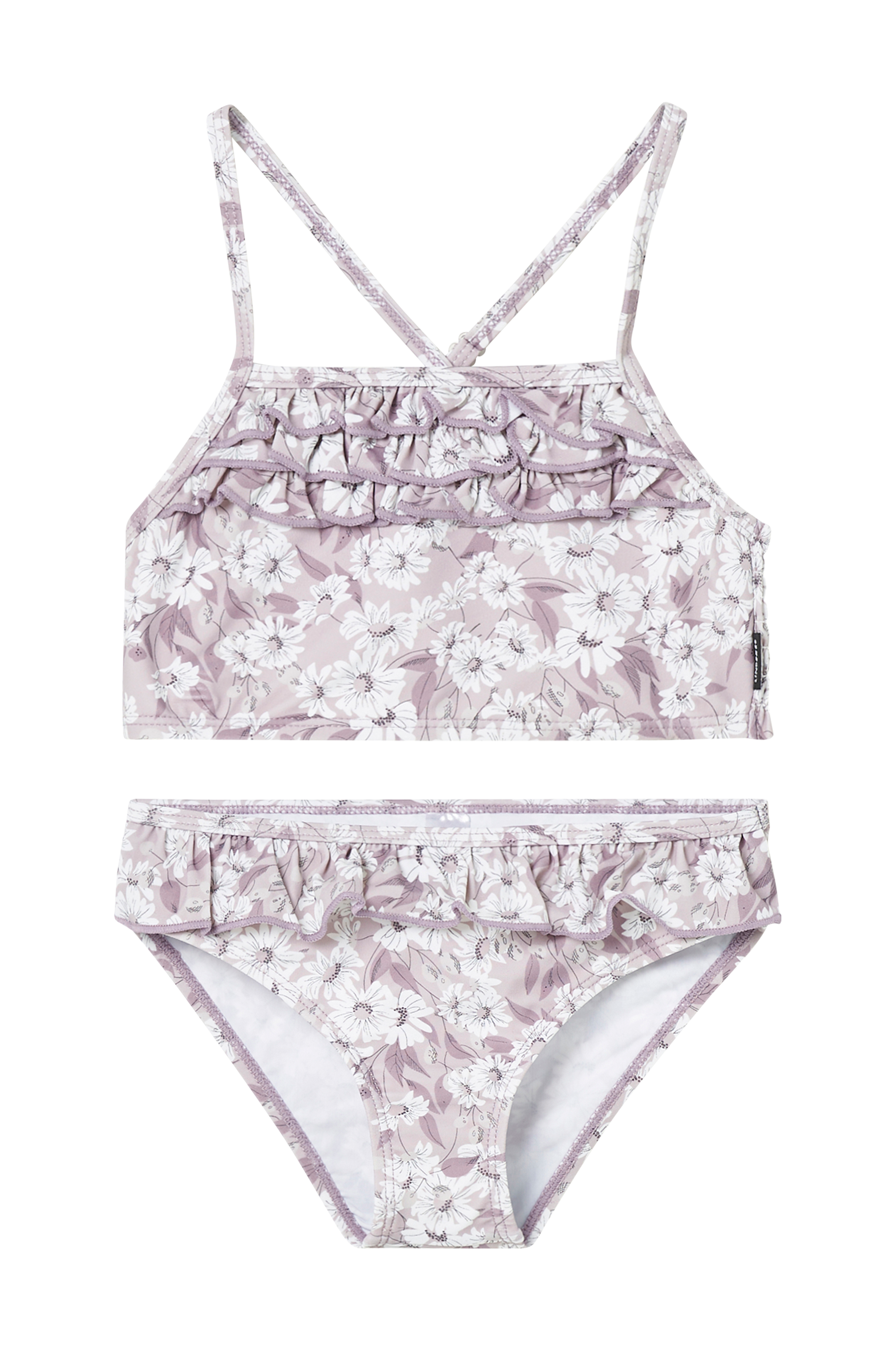 Bikini med flæser, ekstra for foran og skulderstropper som danner et kryds på ryggen. Toppen har smockdetaljer bagpå for en skøn og smidig pasform. Materialet har en solbeskyttelsefaktor på 50+.