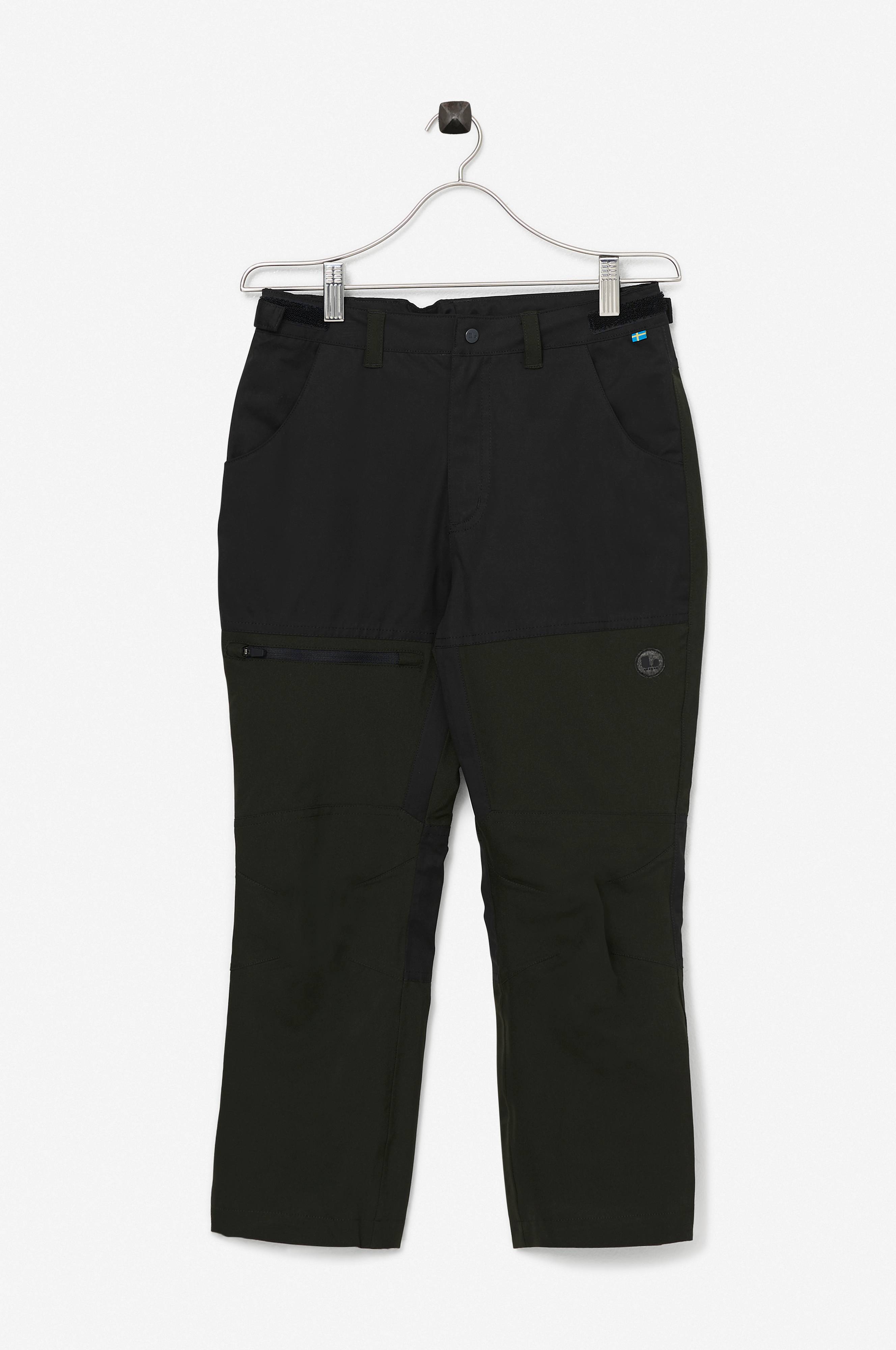 Linningen er regulerbar. Stropper, knap og gylp med lynlås. To lommer foran og en baglomme med lynlås. En benlomme med lynlås. Regulerbar vidde i benkant.