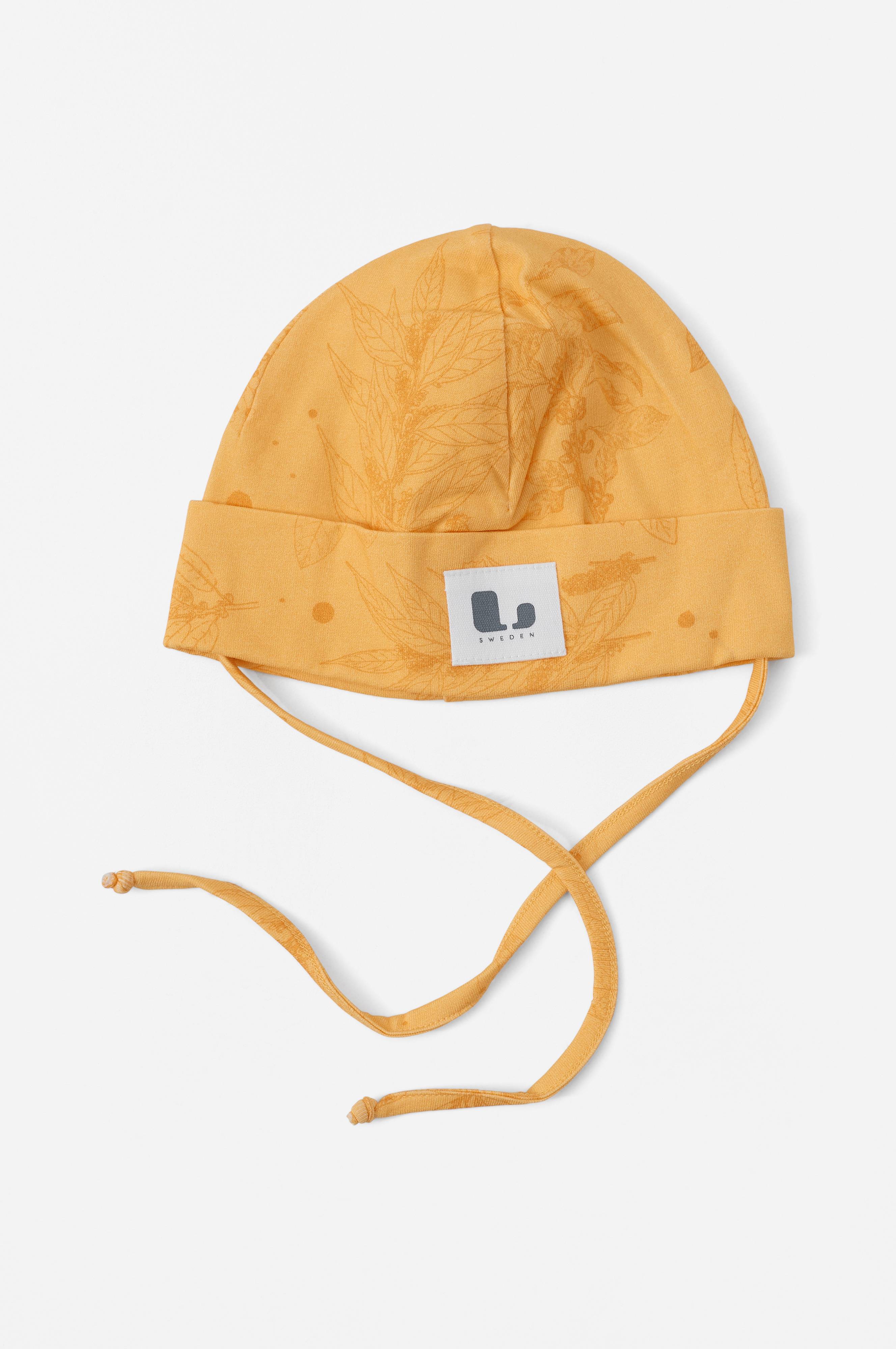 Model i blød stretchjersey med kant der kan foldes ned og smal snøre under hagen.