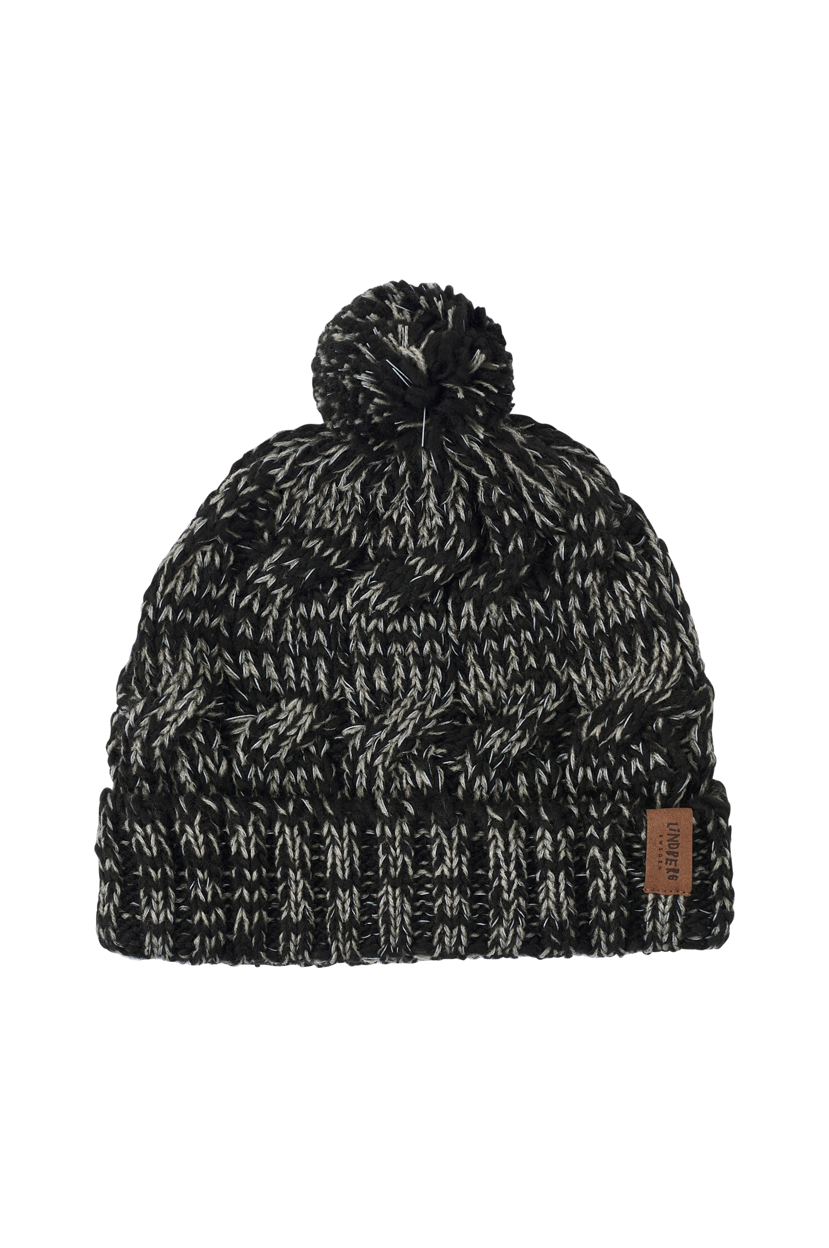 Hue Night Light fra Lindberg i uldblanding med kabelstrik og refleksgarn. Opslag forneden og stor kvast foroven. Huen har blødt fleecefor forneden.