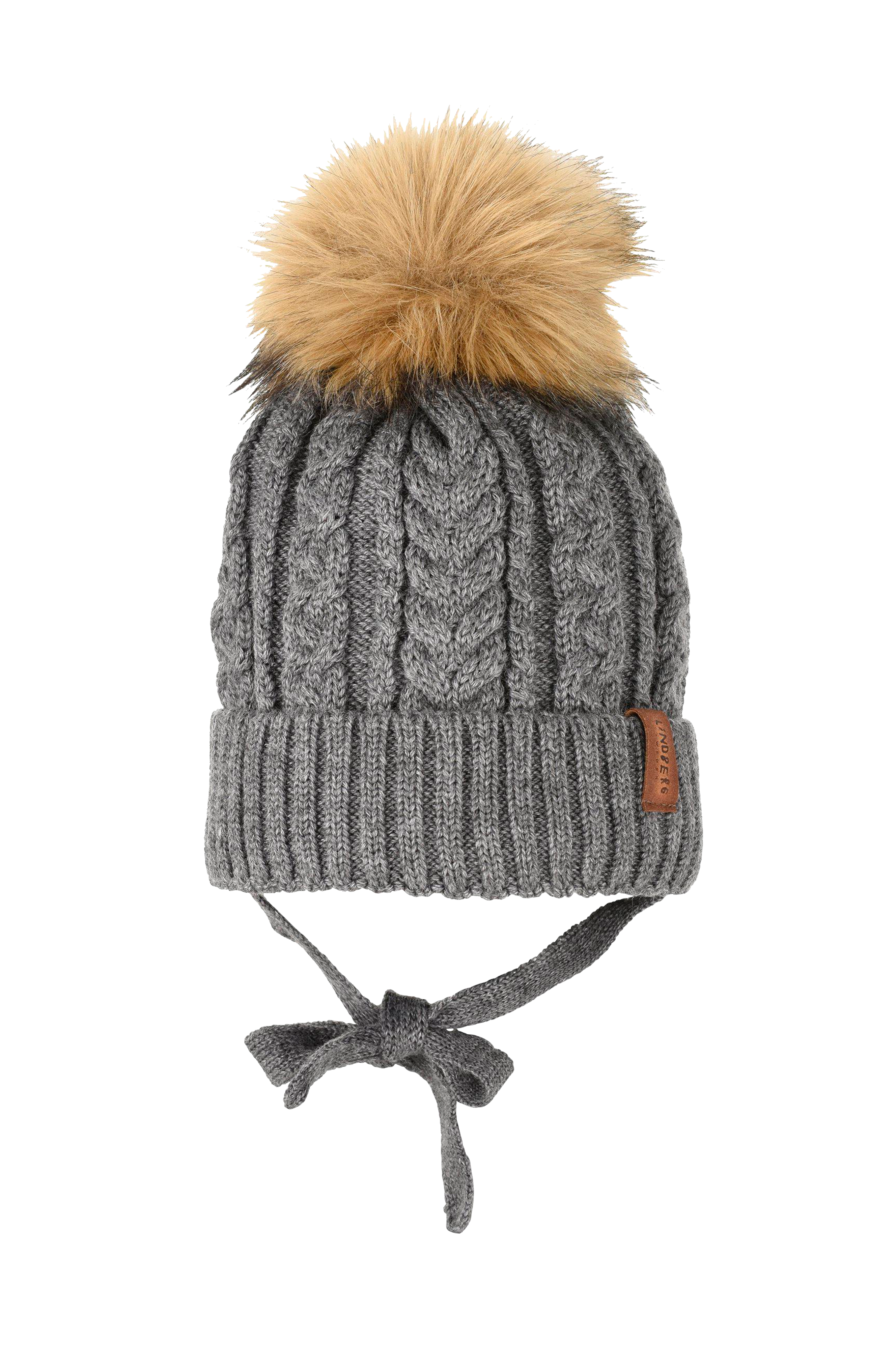 Hue Sunne Hat fra Lindberg i kabelstrikket model i varmende uldblanding med blødt for i bomuldsjersey. Overdimensioneret kvast i kunstpels på toppen. Kant, der kan foldes op samt bindebånd under hagen.