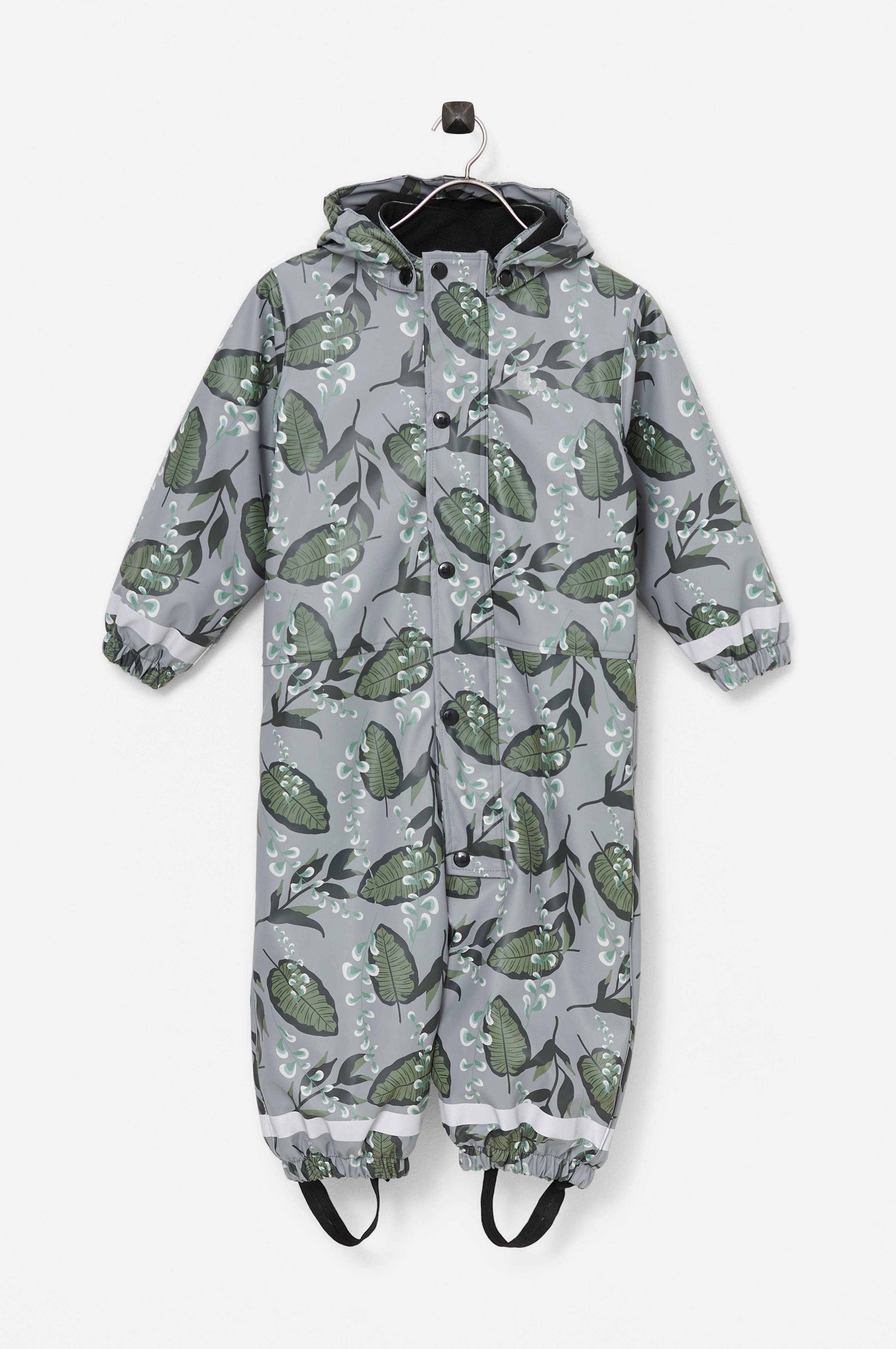 Regnheldragt i PU med blødt fleecefor er perfekt til dage med regn og sjap, hvor du vil holde dit barn tørt og varmt. Dragten er vandtæt og alle sømme er svejsede for at vand ikke kan trænge ind. Vandsøjletryk 8000 mm. Aftagelig, fleeceforet hætte med elastik i siderne. Høj krave med blød fleece på indersiden. Lynlås med hagebeskytter og beskyttende overfald over lynlåsen med trykknapper. Elastik i ærmekant og benkant. Aftagelige og justerbare elastiske fodstropper. Refleksdetaljer på ærmer og ben.
