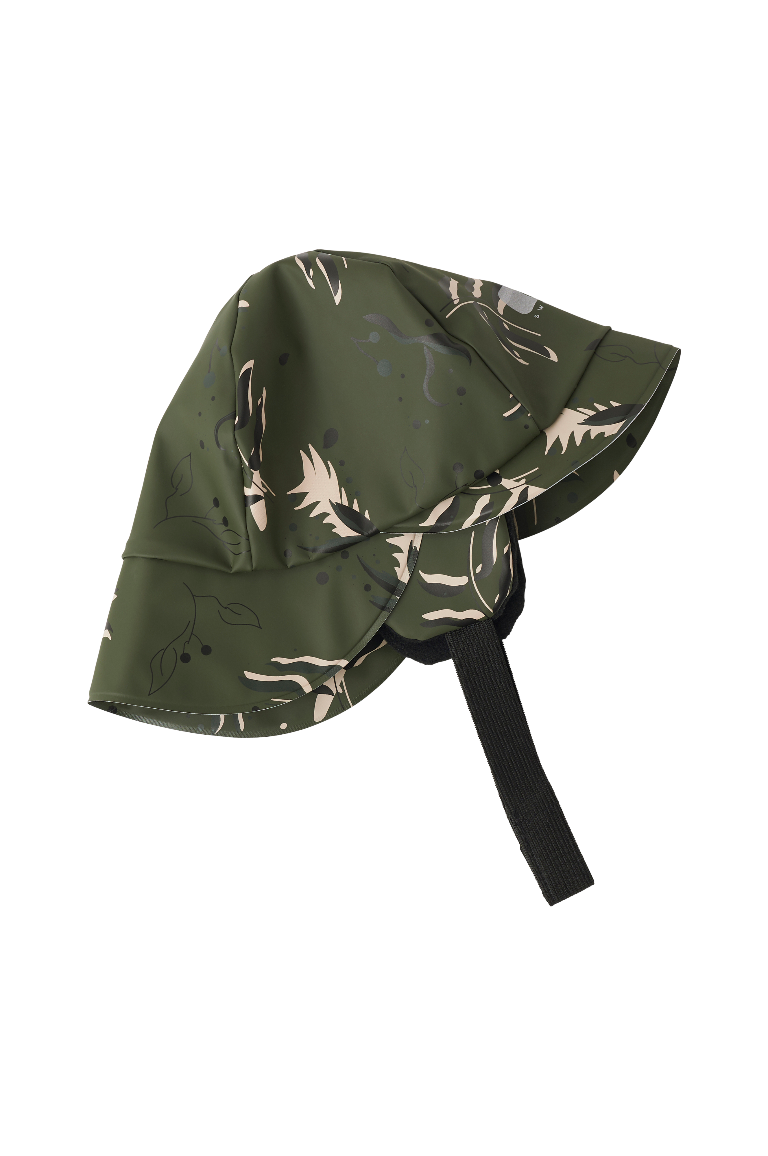 Vandtæt regnhat / sydvest i PU med svejsede sømme, en vandtæthed på 8000 mm og justerbar rem under hakan. Skygge både foran og bagpå for at regndråberne let kan løbe af og ikke når barnets ansigt eller nakke. Den har fleeceforede øreklapper men er uforet i resten af hatten.