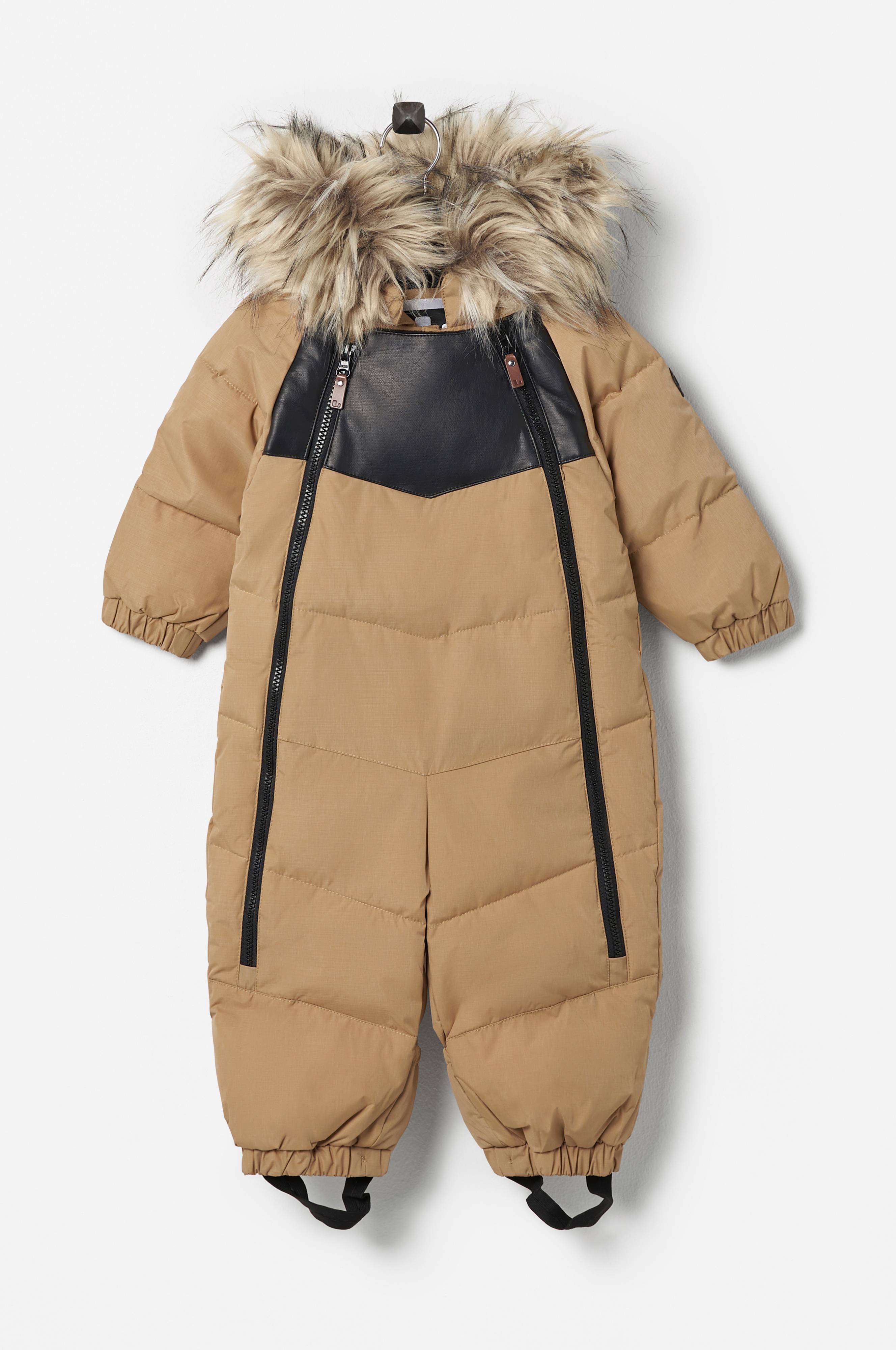 Vinterflyverdragt Rocky fra Lindberg. En flyverdragt til de aller mindste som er varmt vintervatteret og har en vandafvisende overflade med indsats i imiteret skind foroven.