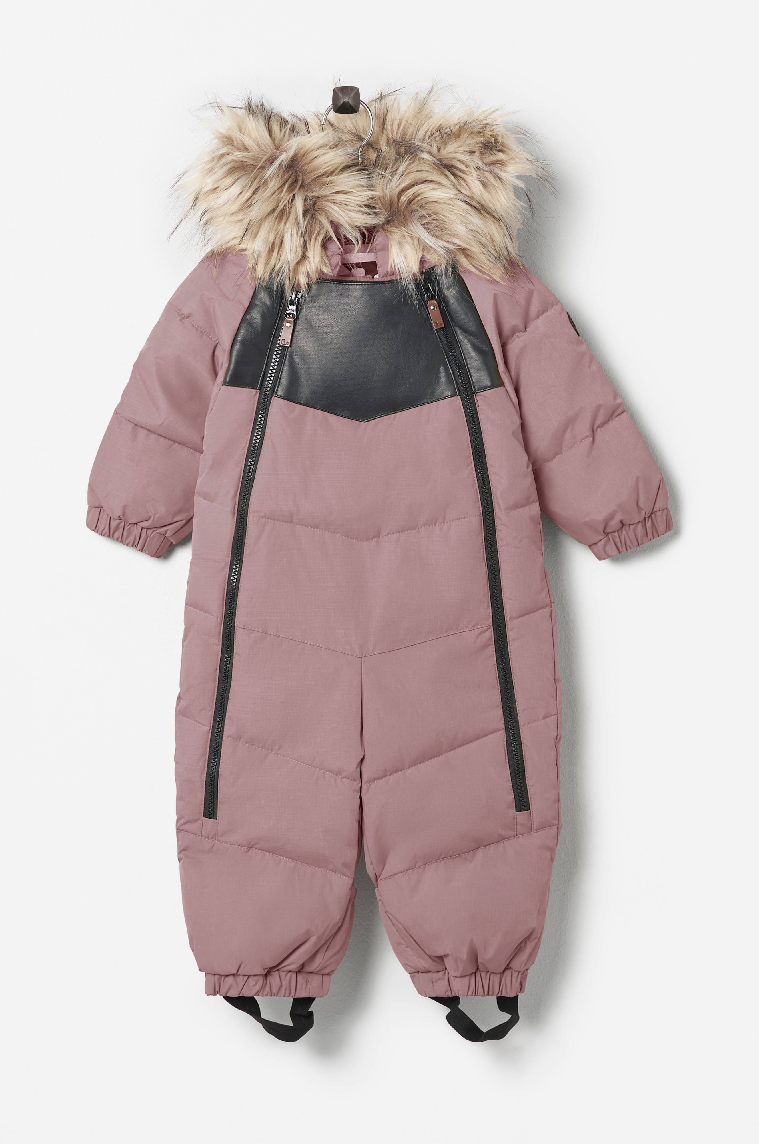 Vinterflyverdragt Rocky fra Lindberg. En flyverdragt til de aller mindste som er varmt vintervatteret og har en vandafvisende overflade med indsats i imiteret skind foroven.