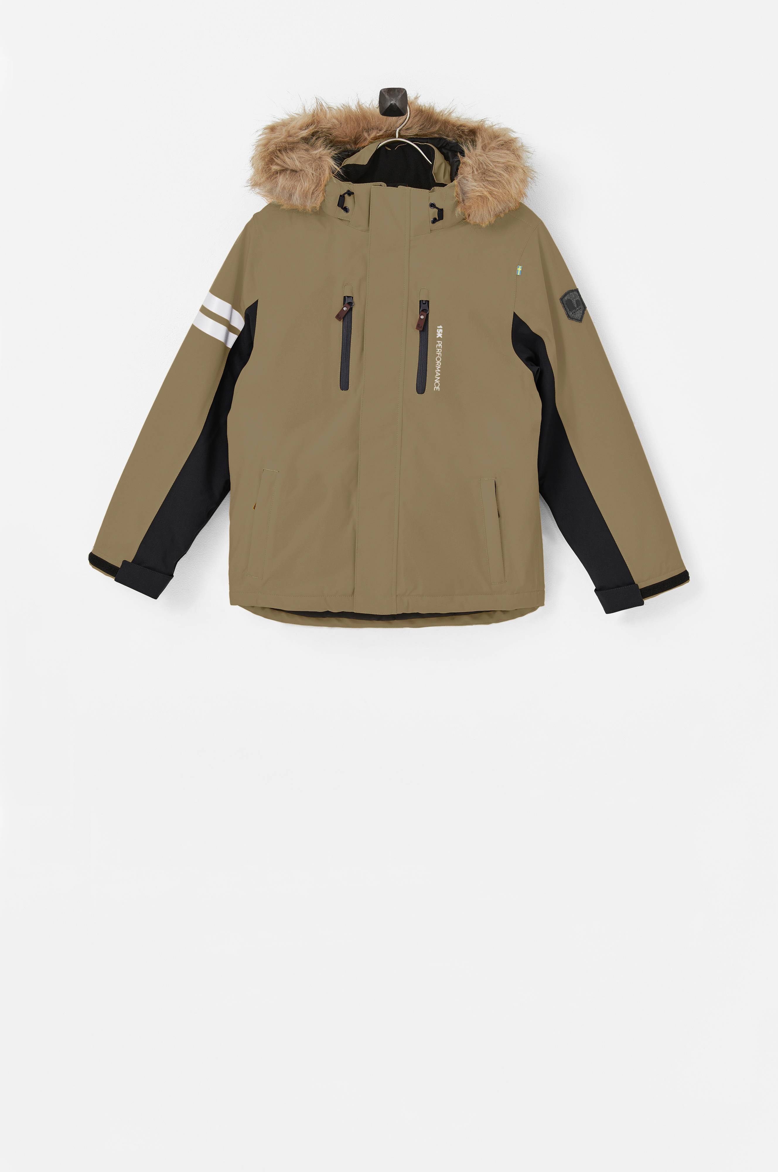 Aftagelig, foret og justerbar hætte med aftagelig kant af kunstpels. Høj krave med børstet, blød tekstil på indersiden. Lynlås med hagebeskytter og et beskyttende overfald over lynlåsen med velcrolukning. Regulerbar vidde i ærmekant og løbegang med stop i kanten forneden. Fire lommer foran med lynlås samt en inderlomme i mesh. Aftageligt snefang i taljen. Refleksdetaljer hele vejen rundt.