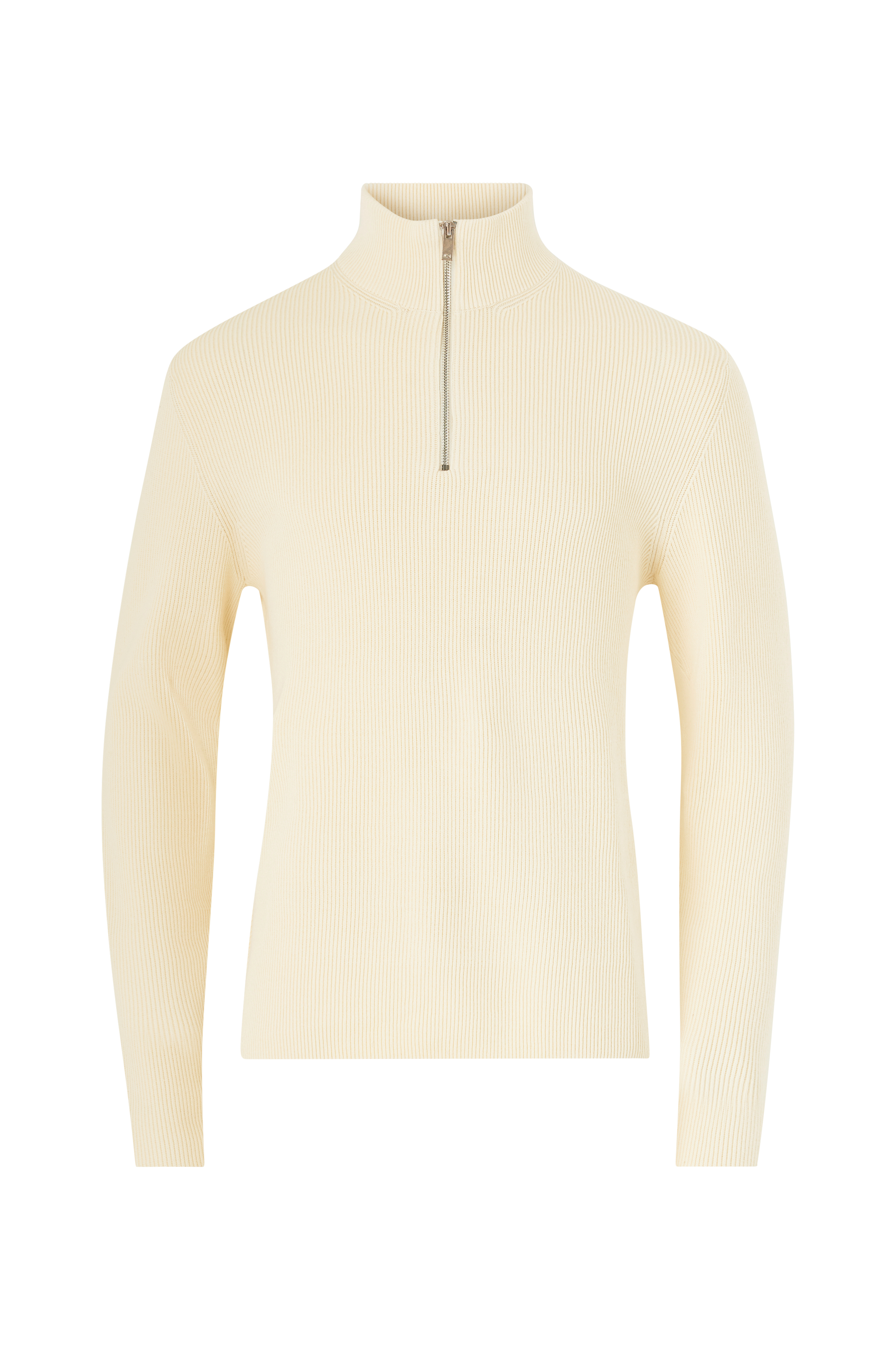 • Lige, ribstrikket model• Høj krave med kort lynlås