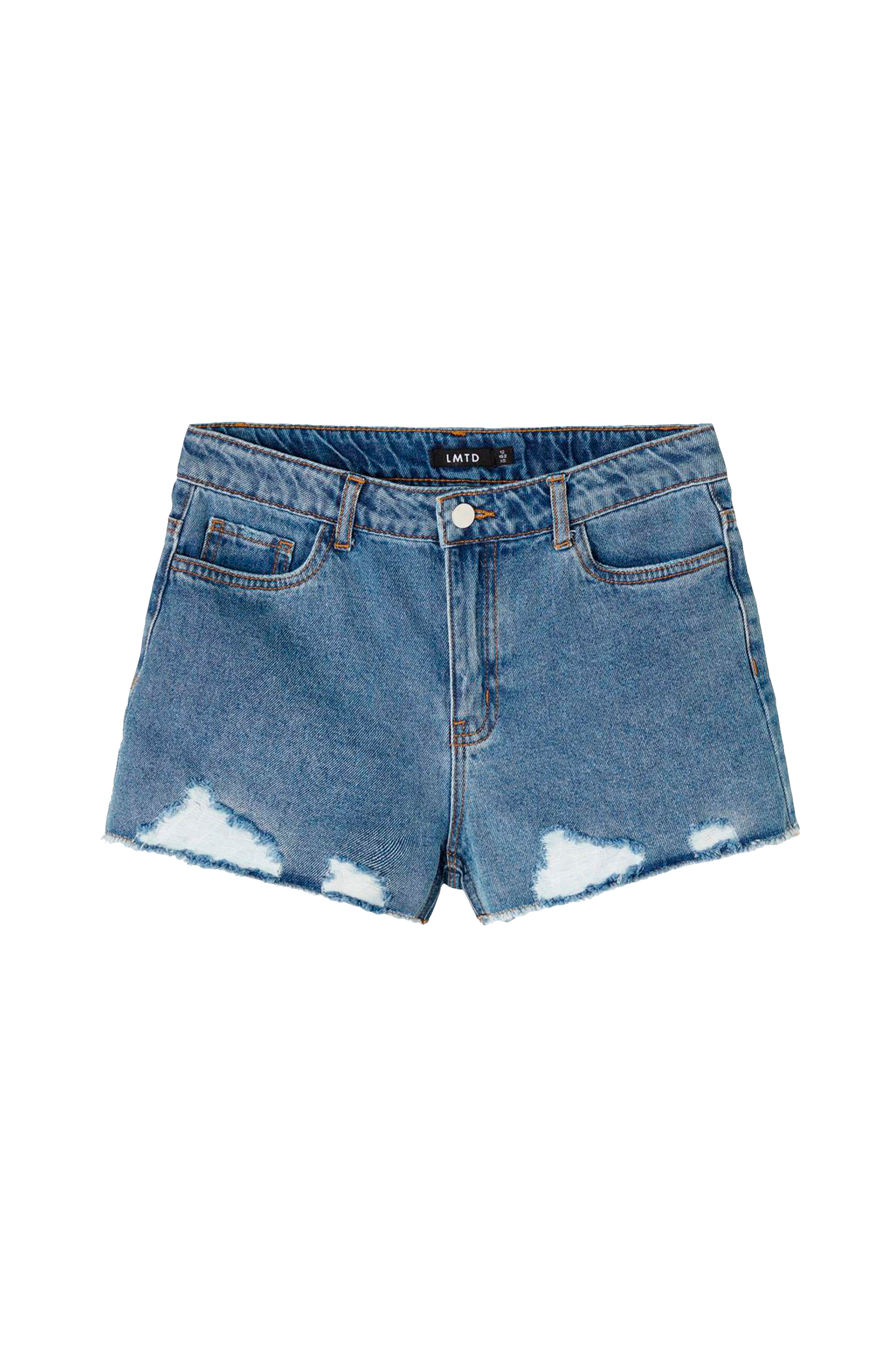 Denimshorts i 5-lommemodel med slidte detaljer foran og frynsede benkanter. Lynlåsgylp. Justerbar talje med indvendig knapelastik.