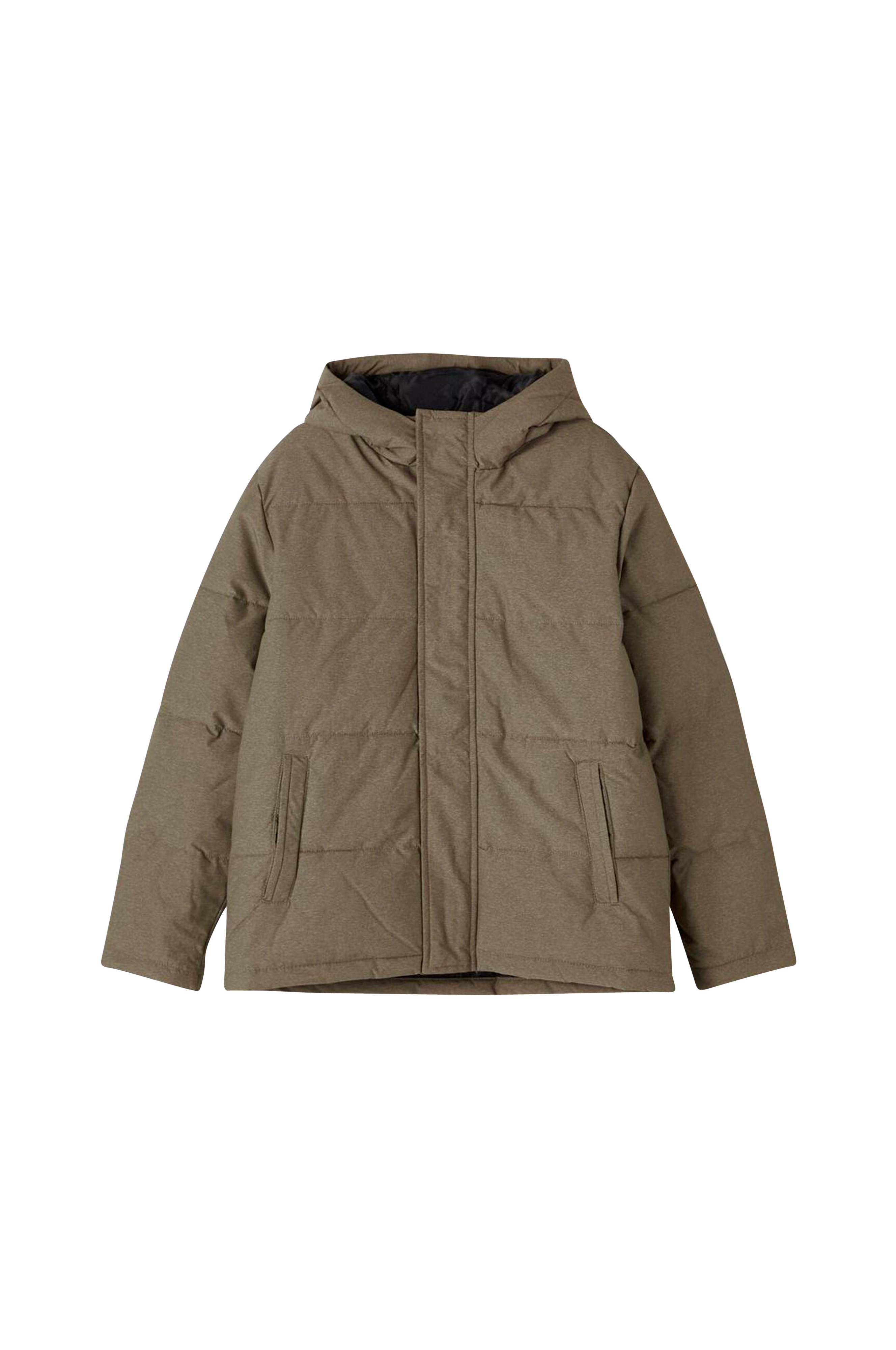 Vatteret jakke med vandafvisende overflade. Fast hætte. Lukning med lynlås og overfald med velcrolukning. To lommer.