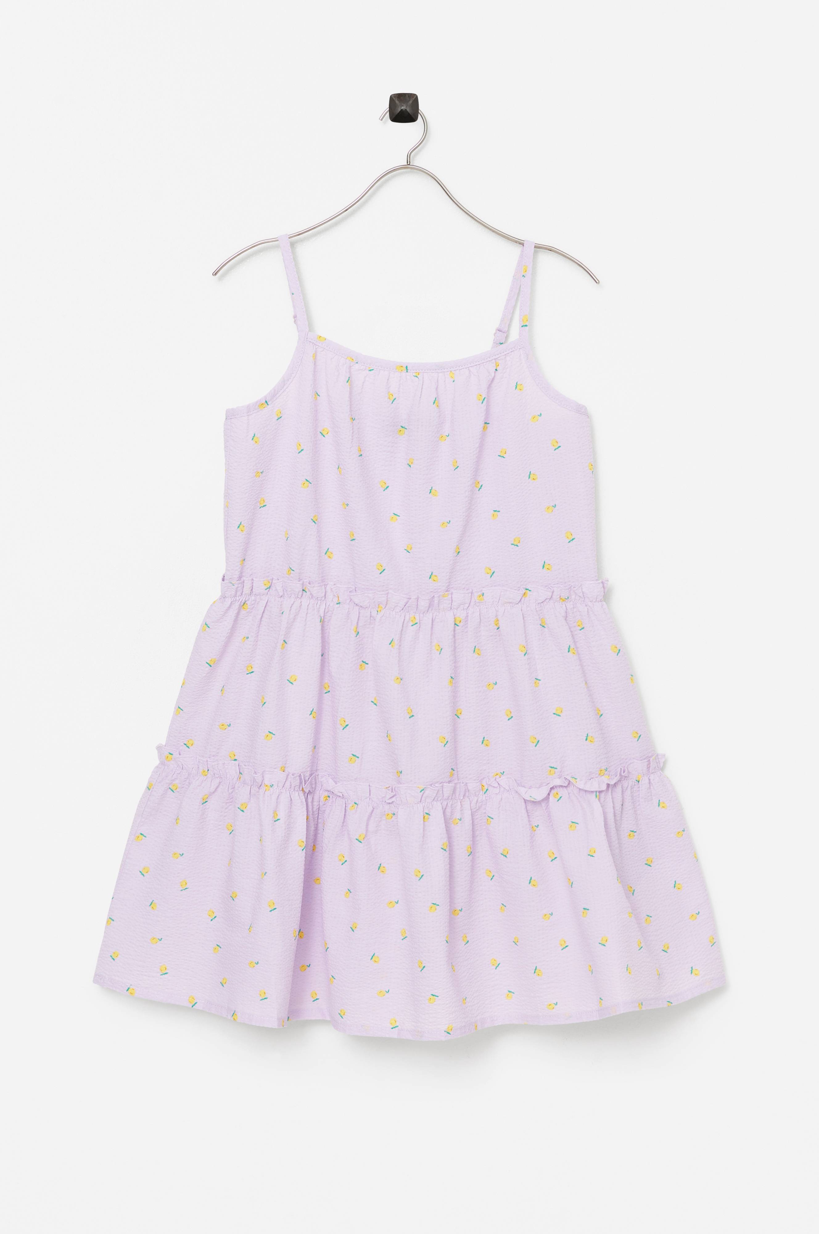 Ærmeløs kjole i let, vævet bomuld med boblestruktur i stoffet og et printet blomstermønster. Justerbare, smalle skulderstopper. Snit med flæser på nederdelen. A-formet model.