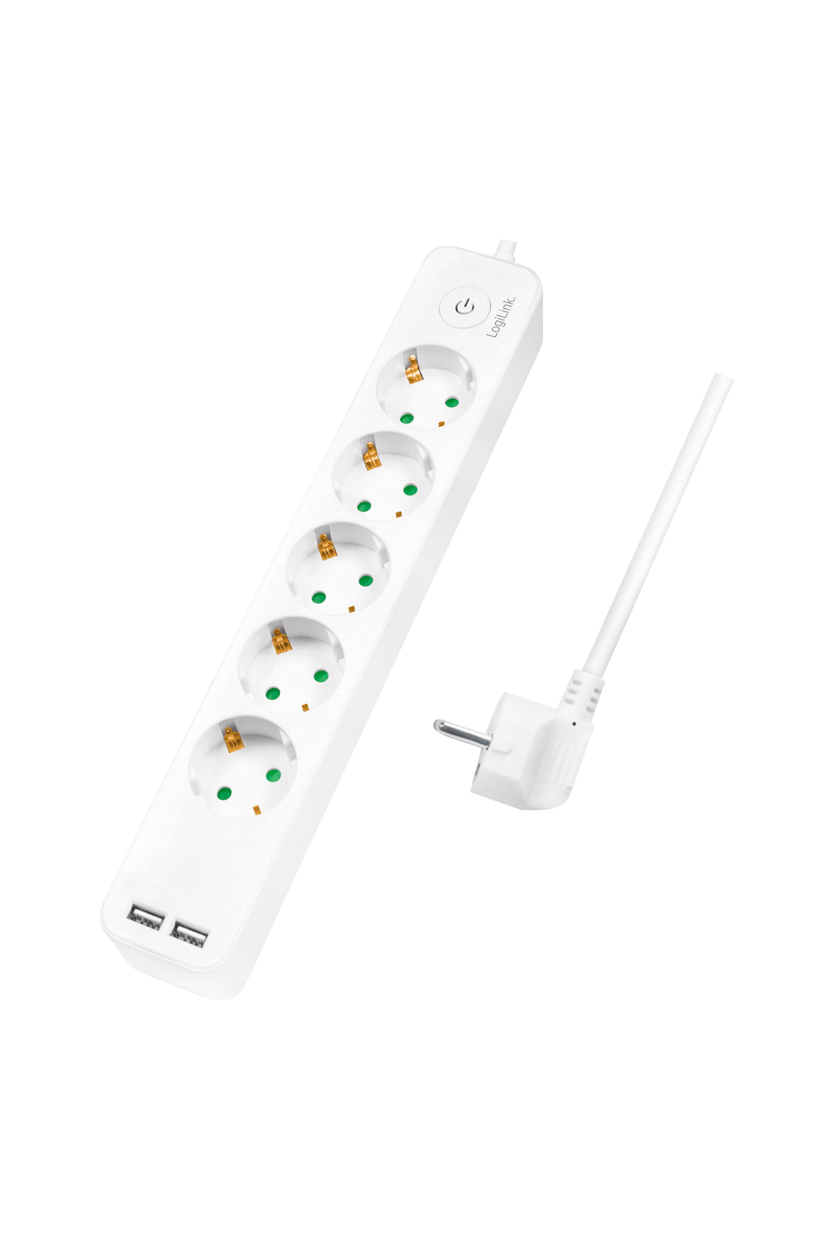 5-vejs strømskinne med rund kontakt og 2 x USB-stik til opladning