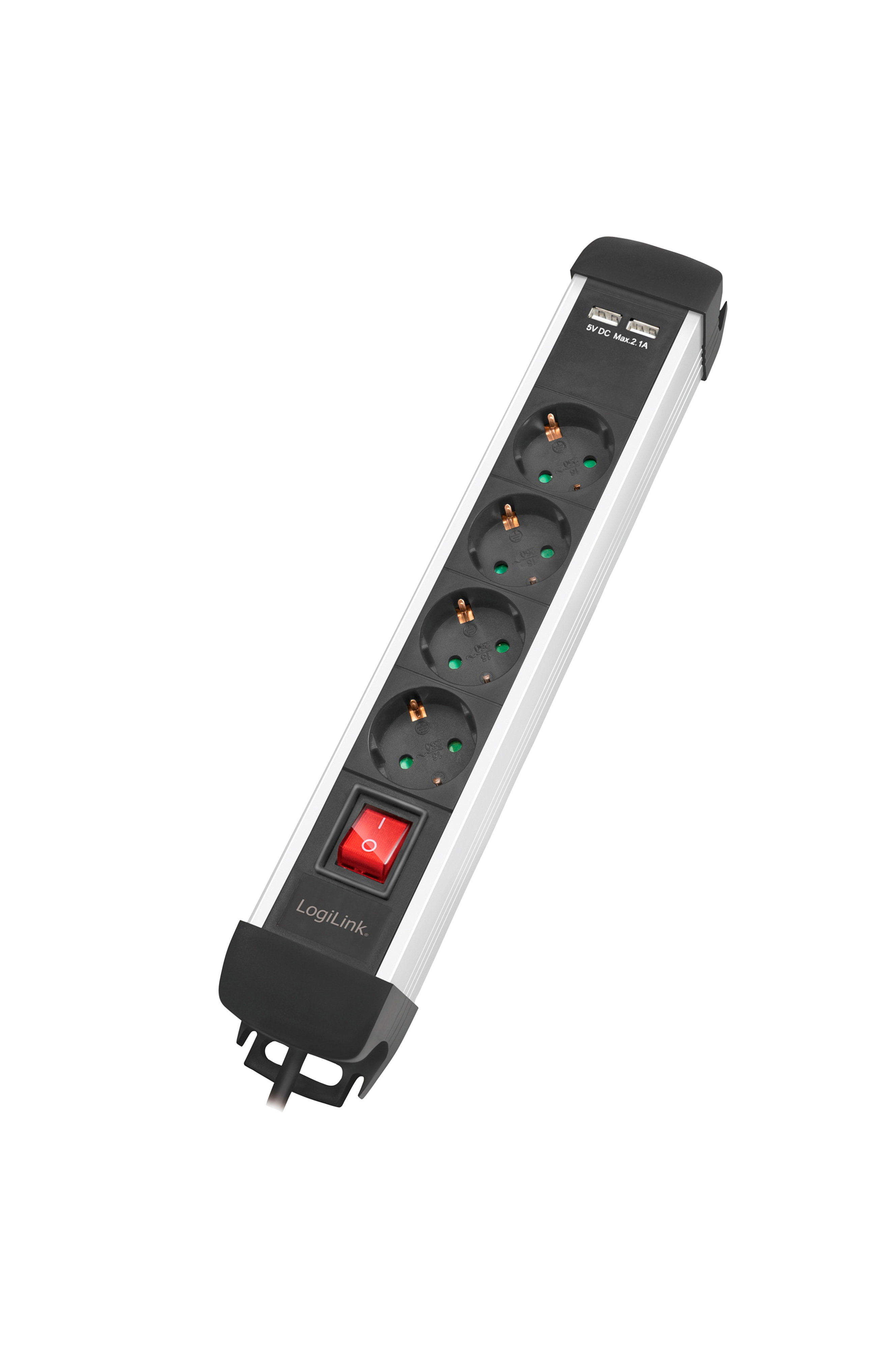 Strømskinne med plads til fire jordede stikkontakter (Schuko) og to USB-porte (5V/2,1A, 10W). Maks. belastning er 3680W med en spænding på 250V. Funktionerne omfatter sikringssikre stik, vinklede og jordede stik, oplyst tænd/sluk-knap og et 1,5 m langt kabel med H05VV-F 3G 1,5 mm²-specifikationer. Den har et holdbart aluminiumskabinet og IP20-klassificering. Dimensionerne er 400 x 75 x 50 mm. Produktet er CE-mærket.