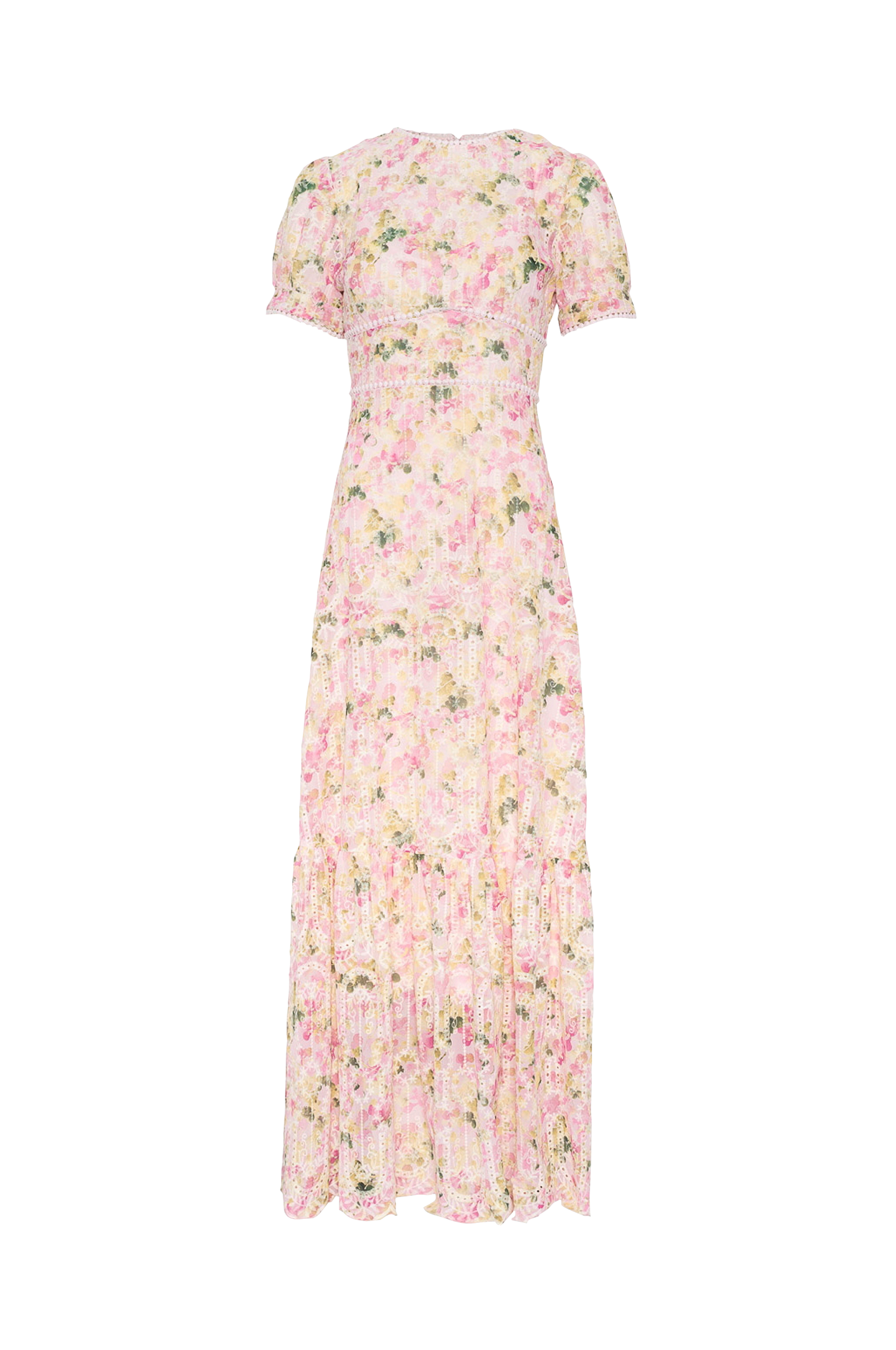 • Lang kjole i chiffon med broderede detaljer• Rund halsudskæring• Korte pufærmer• Defineret talje• Skjult lynlås i ryggen• Volanter ved nederste kant• Foret med tekstil• Længde: 148 cm i størrelse S