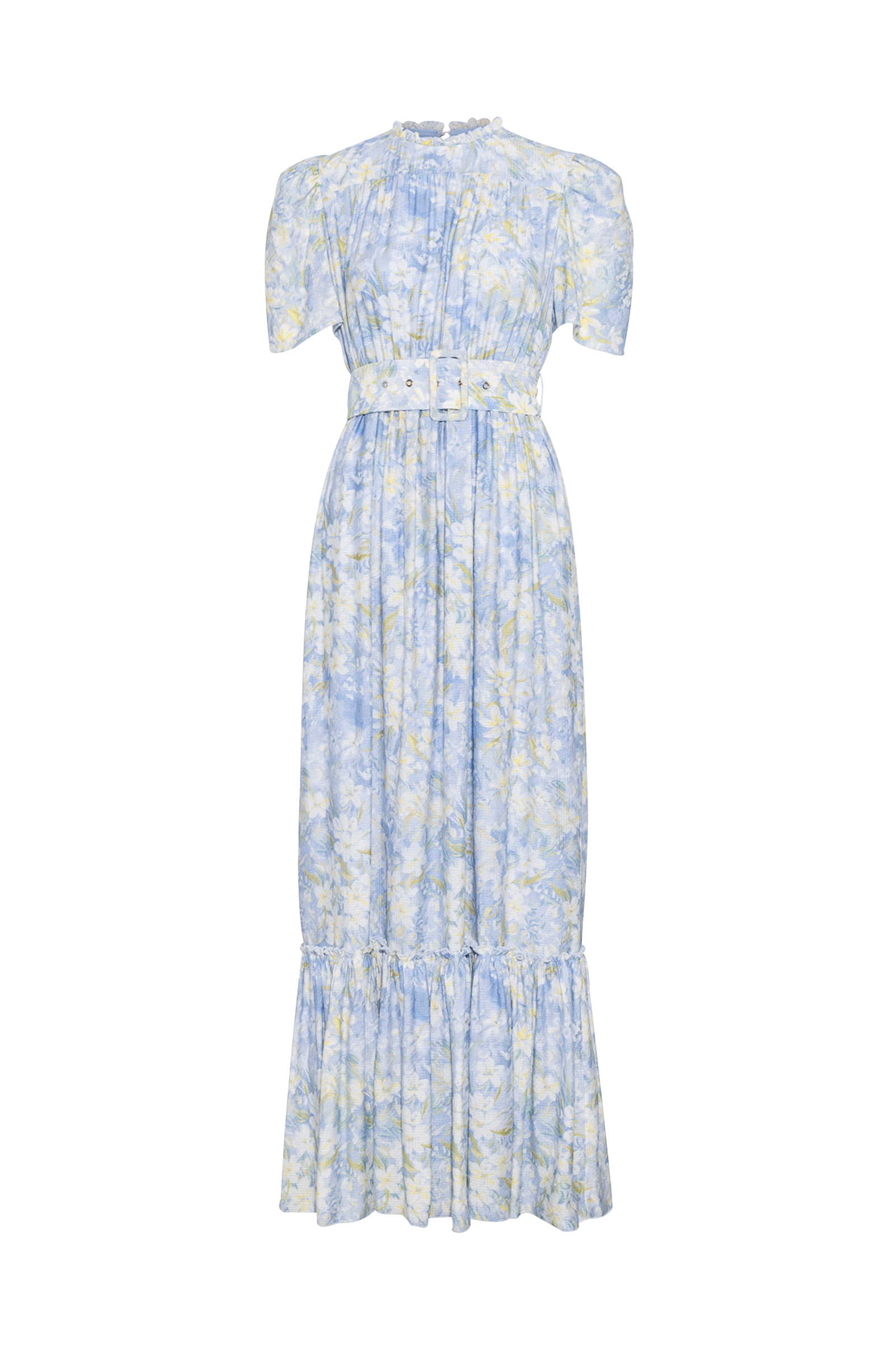• Lang, blomstret kjole• Lille volant i halsen• Ballonærmer med skulderpuder• Bælte i tekstil ved taljen• Elastisk talje• Volant nederst• Slids med knap i nakken• Vævet for• Længde: 145 cm i størrelse S