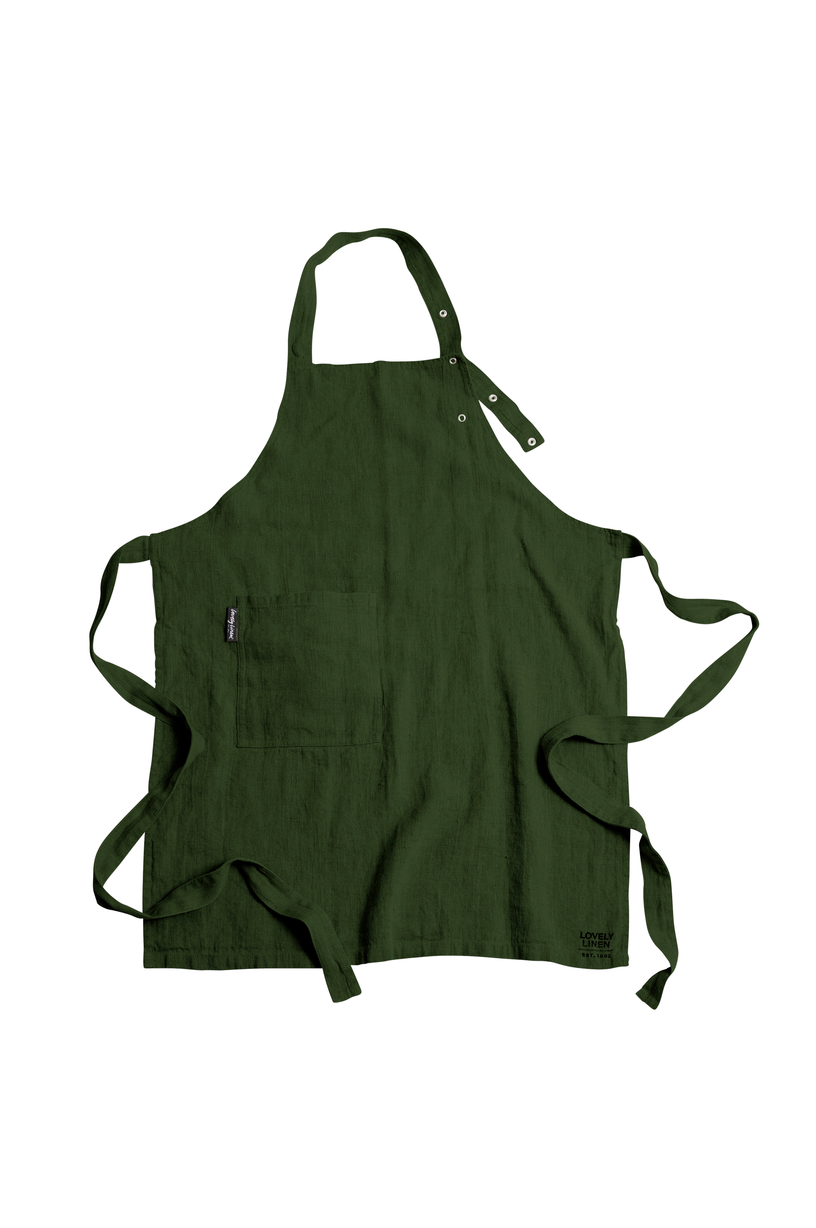 Enkelt og praktisk forklæde i forvasket hør. Praktiske trykknapper hjælper dig til nemt at tilpasse størrelsen efter dine behov.