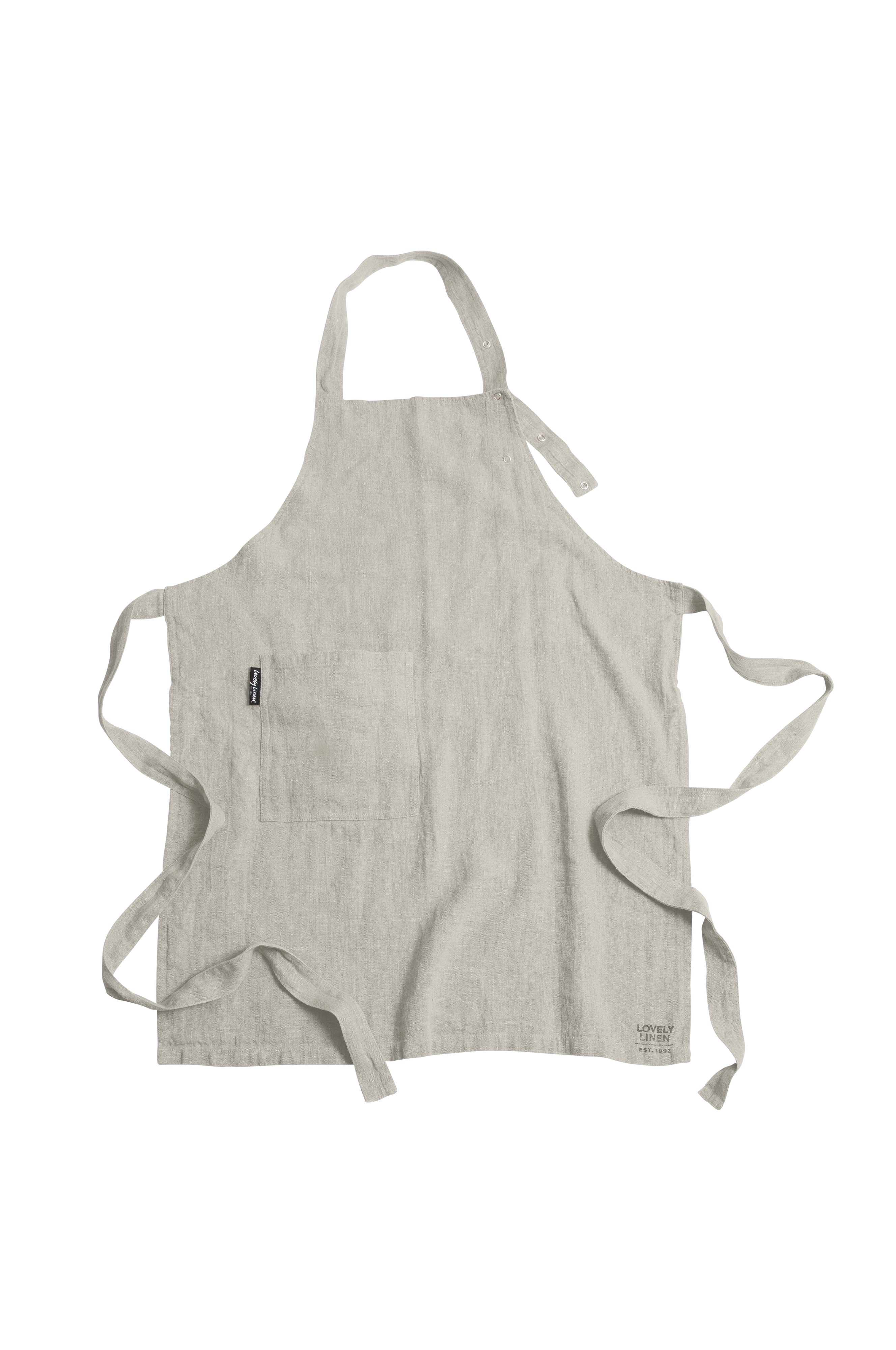 Enkelt og praktisk forklæde i forvasket hør. Praktiske trykknapper hjælper dig til nemt at tilpasse størrelsen efter dine behov.