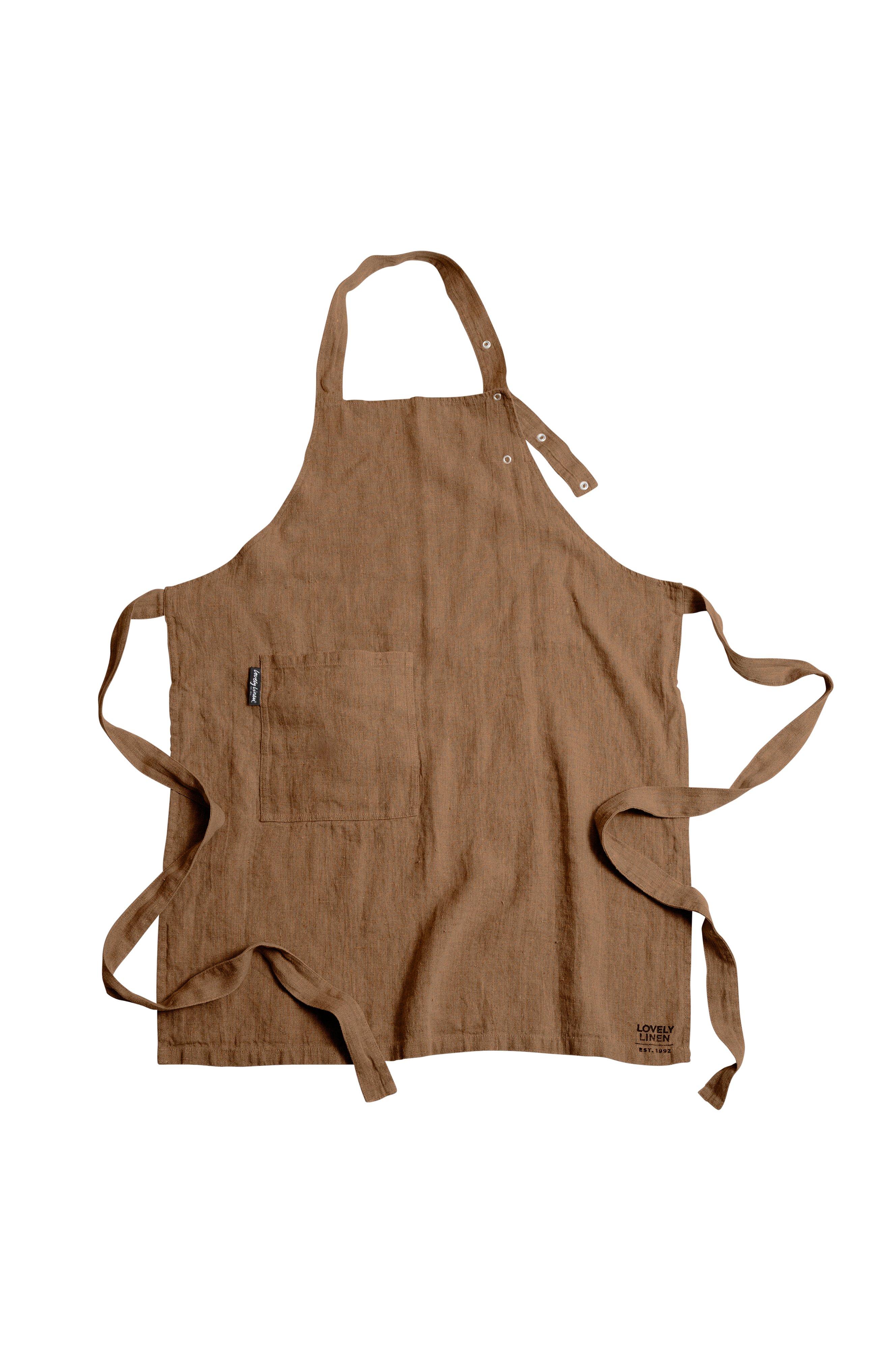 Enkelt og praktisk forklæde i forvasket hør. Praktiske trykknapper hjælper dig til nemt at tilpasse størrelsen efter dine behov.