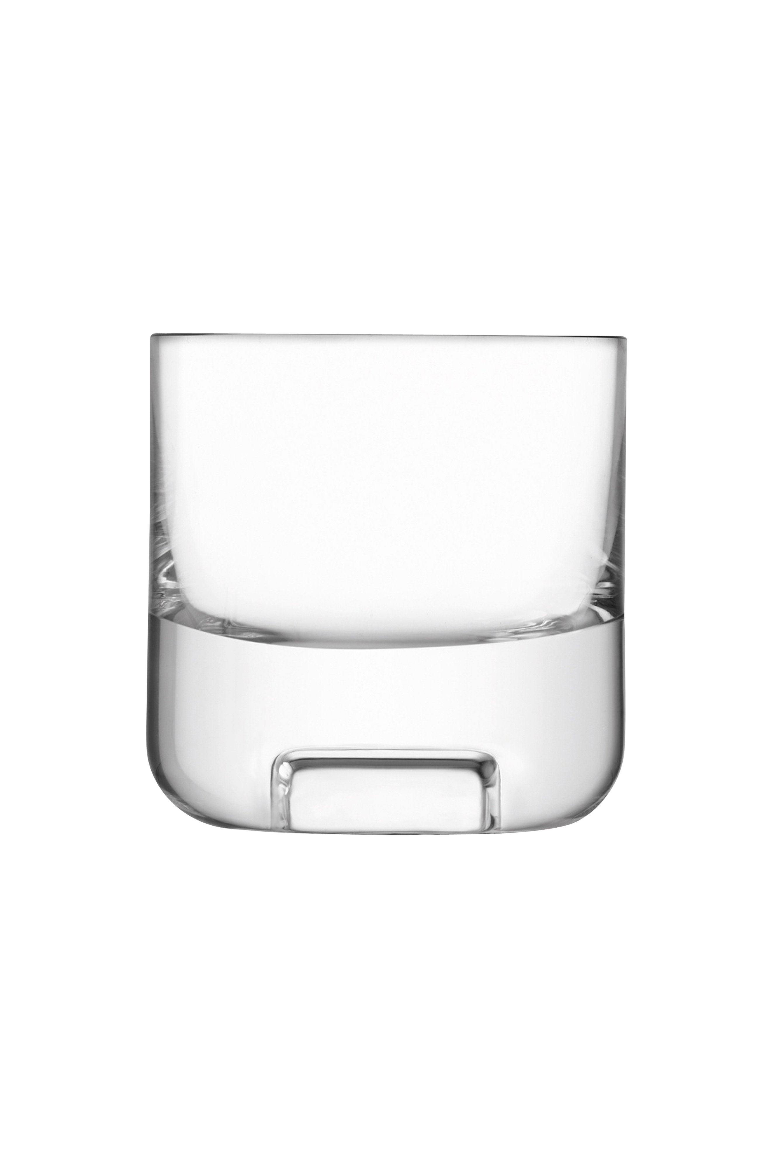 Sæt med to moderne mundblæste whiskyglas. Et terningformet aftryk i den tunge bund minder om en stor isterning.