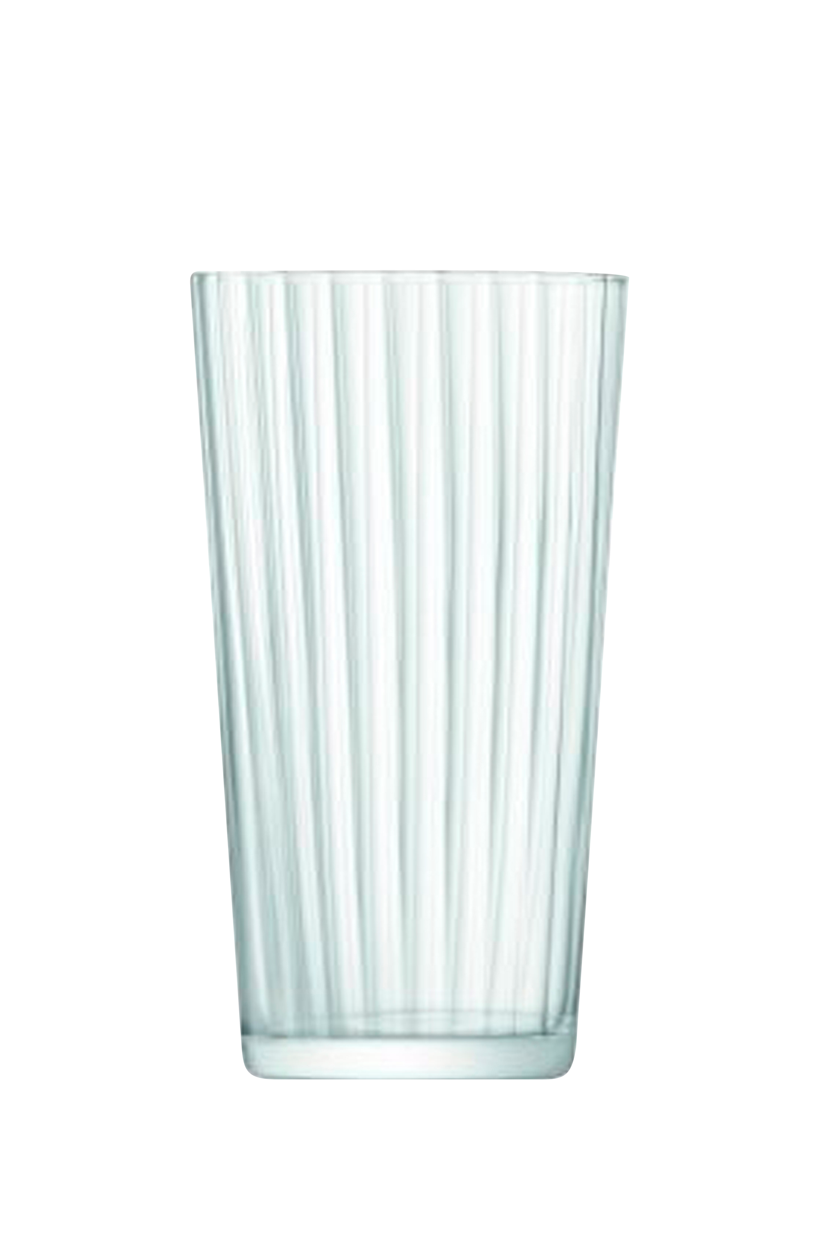 Et sæt med fire slanke, stabelbare glas med en lineær struktur. En alsidig form til juice, pilsner eller vand og is.