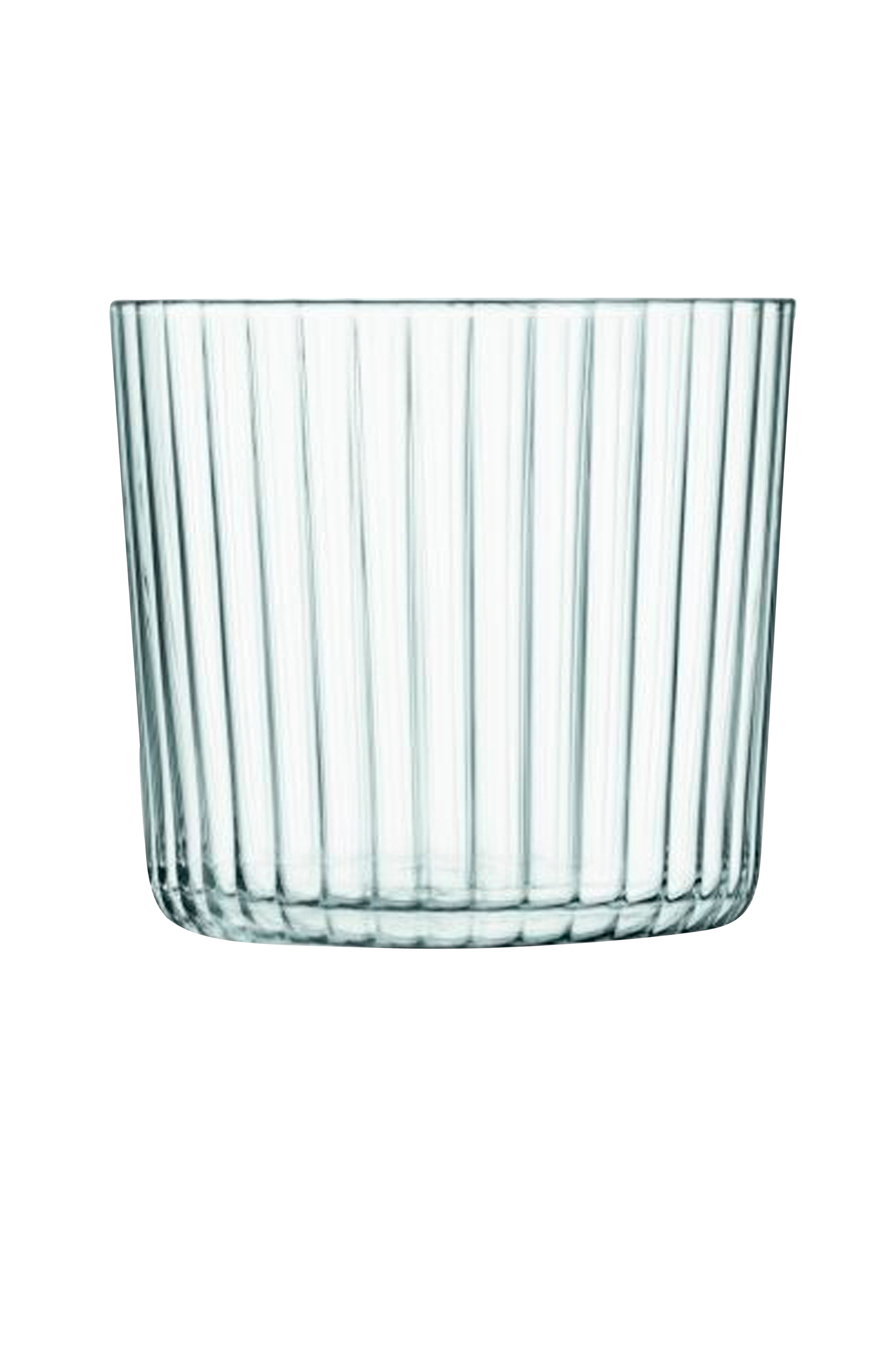 Et sæt med fire lave, finvæggede glas med en lineær struktur og et stabelbart design. Den alsidige form kan også bruges som dessertfad eller skål til nødder og oliven.