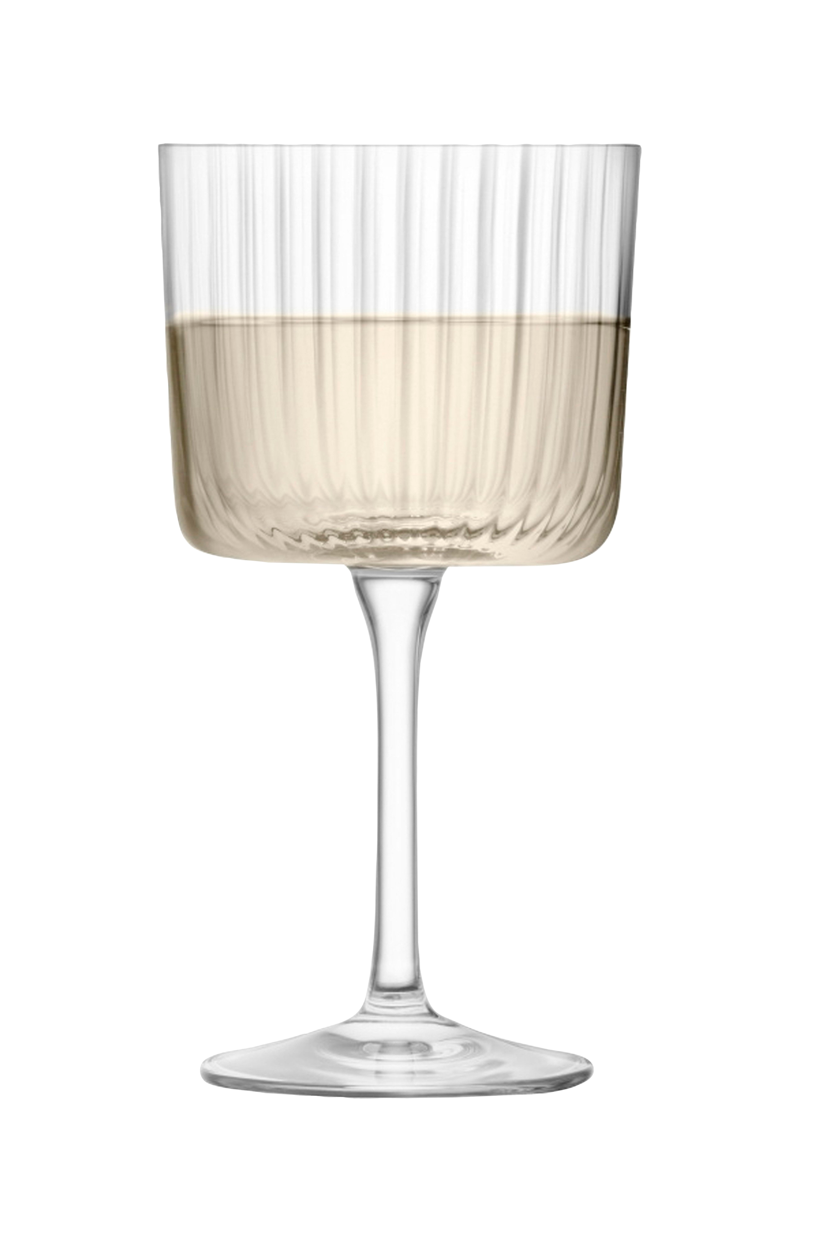 Et sæt med fire vinglas med fine teksturerede vægge, moderne form og afslappede ben. Til servering af vin. Moderne, utilitaristisk design, lineær, struktureret overflade. Glat inderside