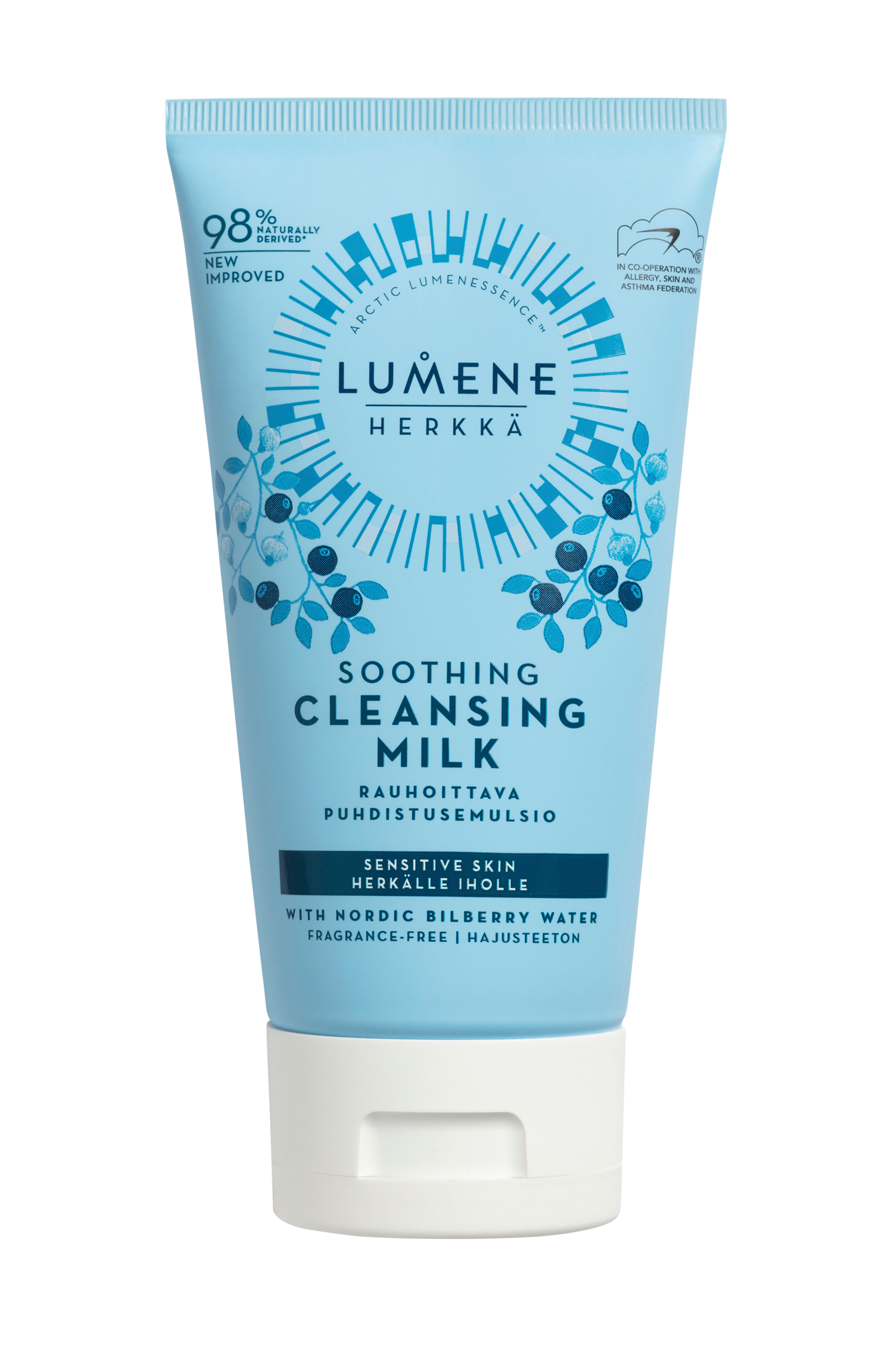 En let rensemælk beriget med blåbærvand og arktisk kildevand, som skånsomt fjerner makeup og urenheder uden at irritere sart hud. Den plejende konsistens beroliger huden og giver den næring, så den straks føles rolig, balanceret og genfugtet. Formlen er parfumefri og er udviklet i samarbejde med Allergi-, Hud- og Astmaforbundet i Finland. Velegnet til sart hud. 100% vegansk.