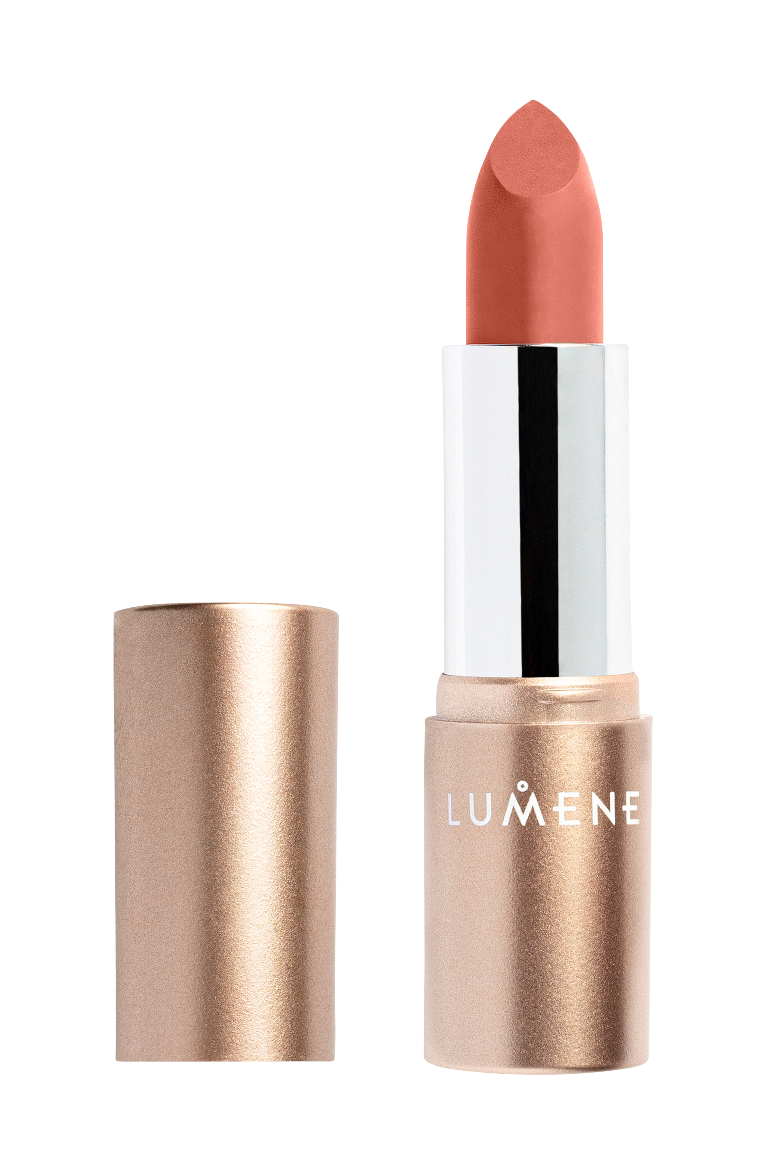 Vegansk læbestift med blød og mat finish som føles behagelig på læberne. Indeholder plejende, nordisk havresmør, bærfrøolie og en blanding af naturlig voks og betain som giver læberne fugt, pleje og beskyttelse.