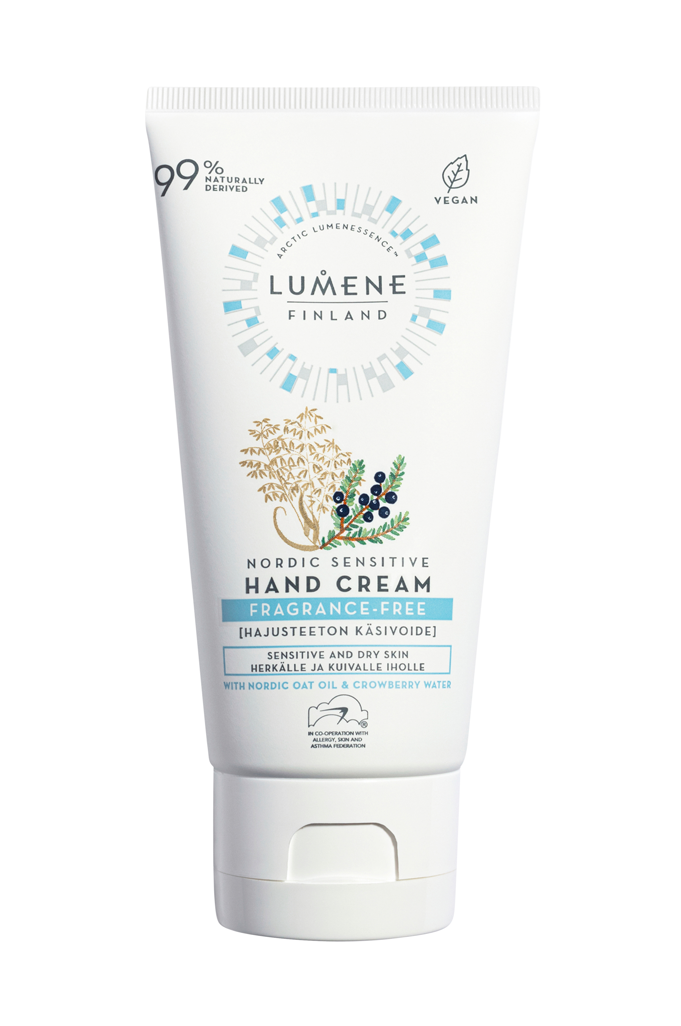 Fugtgivende, parfumefri håndcreme fremstillet til følsom og tør hud. Giver hænderne en blød og behagelig pleje. Indeholder beroligende nordisk havreolie og fugtgivende nordisk sortebærvand. I samarbejde med Allergi-, Hud- og Astmaforbundet i Finland. Vegansk.