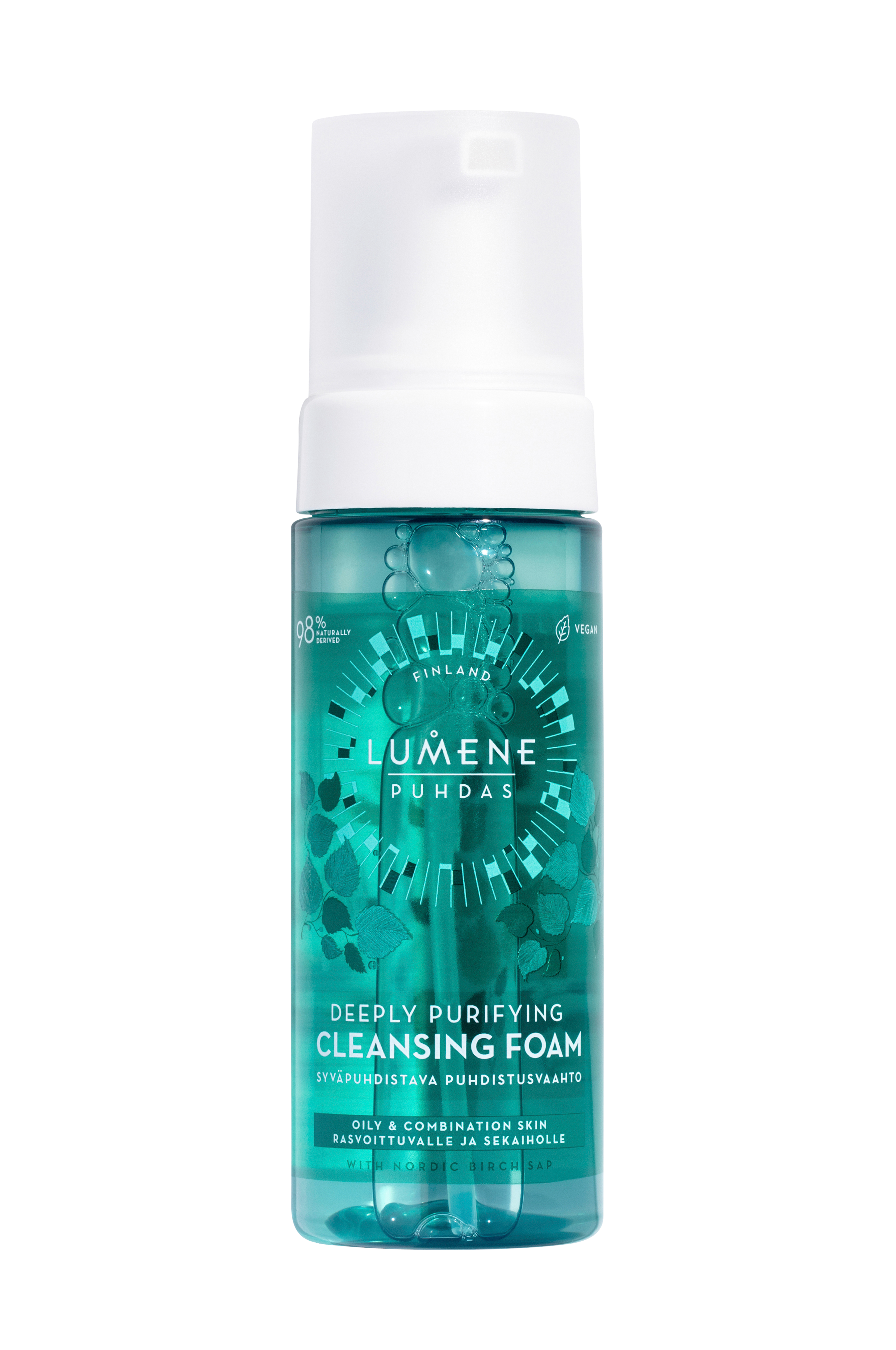 Lumene Puhdas Deeply Purifying Cleansing Foam til fedtet og kombineret hud fjerner effektivt makeup, urenheder og overskydende olie og giver straks huden et mat og rent udseende. Den milde og luftige mousse indeholder plejende økologisk nordisk birkesaft, der virker kølende og gør huden frisk og fuld af energi efter rensning. Vegansk.