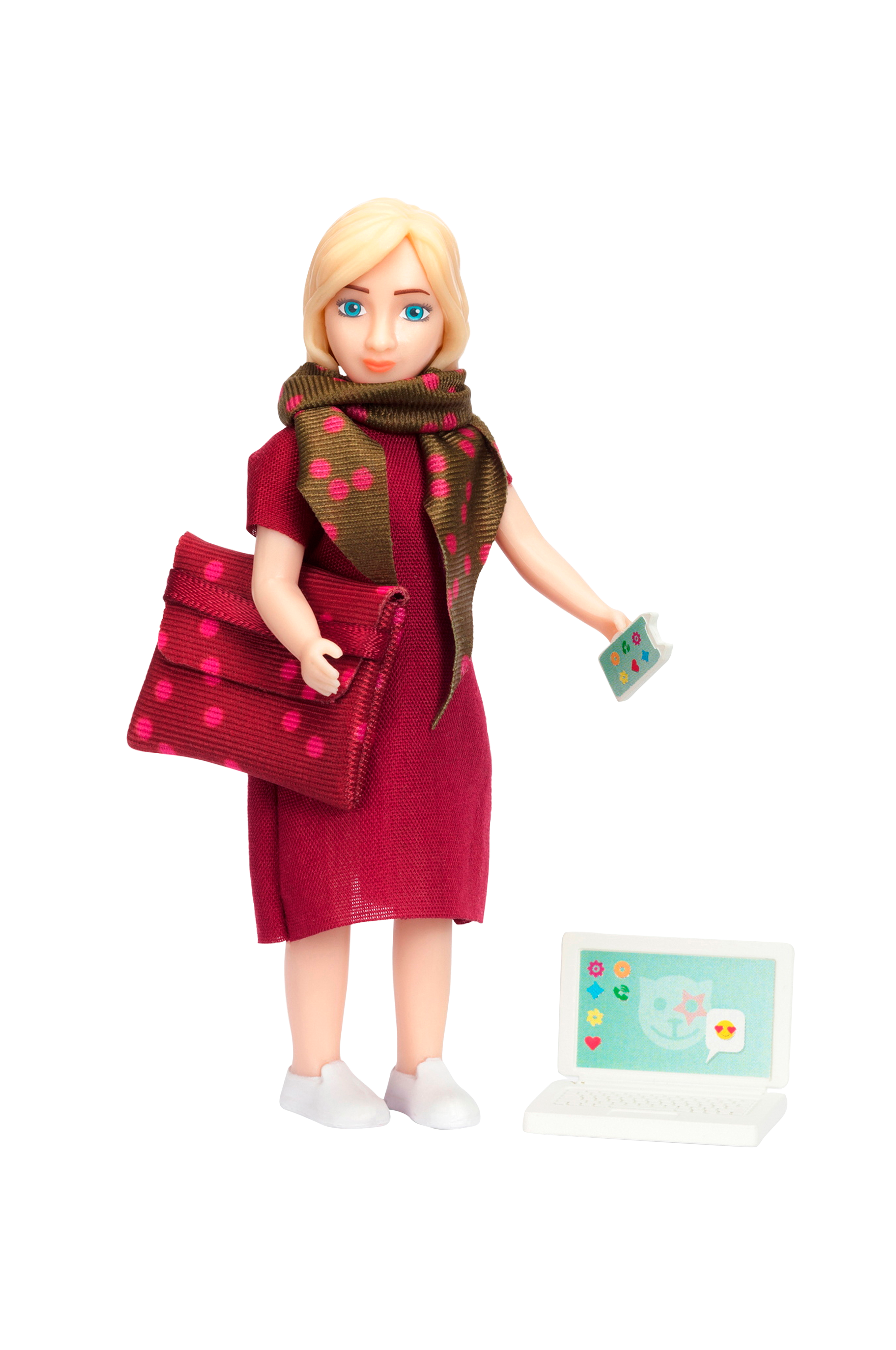 En fin dukkehusdukke med en laptop, computertaske og en mobiltelefon. Lundbys fine dukkehusdukker har alle de detaljer, du kan ønske dig. Dukkerne kan bevæge hoved, arme og ben. Dukketøjet kan tages af for ekstra sjov leg.